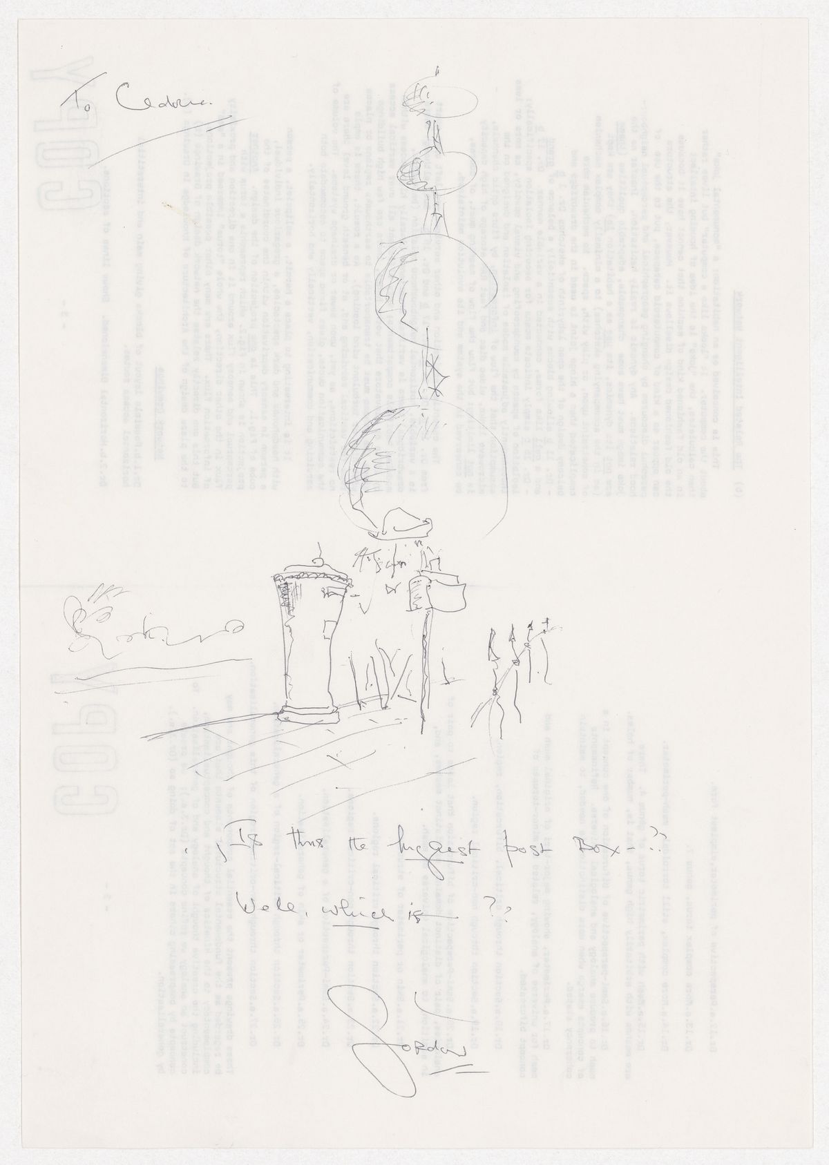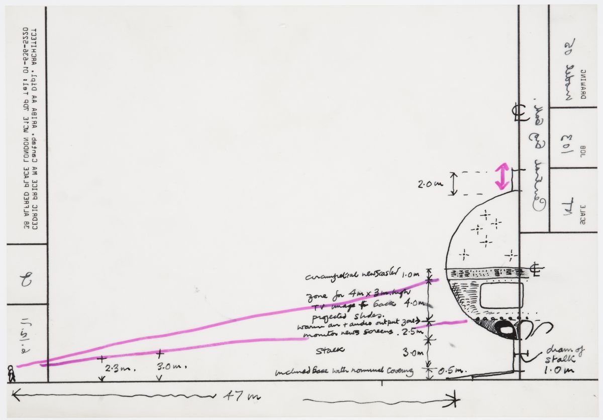 Price n’était pas étranger à l’idée d’utiliser de grands éléments sphériques à des fins civiques. Le projet Olympia – imaginé pour la place piétonne du village olympique de Munich en 1972 – impliquait aussi un élément sphérique de grande taille avec des installations multimédias proposées au public. Toutefois, comme le montrent les affiches du concours Techno-Trees, les capsules sphériques pourront fonctionner à une toute autre échelle : elles pourraient communiquer entre elles et avec d’autres installations de ce type capables d’échanger des informations. Le projet reposait sur le principe que l’infrastructure proposée permettrait un flux et un stockage illimités d’informations, puisqu’elle disposerait d’un minimum de soixante gigaoctets de mémoire vive et de stockage, ainsi que de quelques canaux en fibre optique/coaxial et de lignes téléphoniques – une estimation généreuse pour l’époque. Le réseau agirait comme un « facteur invisible », et les arbres techno individuels comme des boîtes aux lettres de haute technologie « disponibles pour un accès et une utilisation aléatoires »3. Dans une note adressée à Price, Pask a représenté un Techno-Tree à côté de ce qui semble être une boîte aux lettres traditionnelle surdimensionnée, du type de celles largement utilisées en Grande-Bretagne, et demande, avec ironie, laquelle est la plus grande boîte aux lettres.