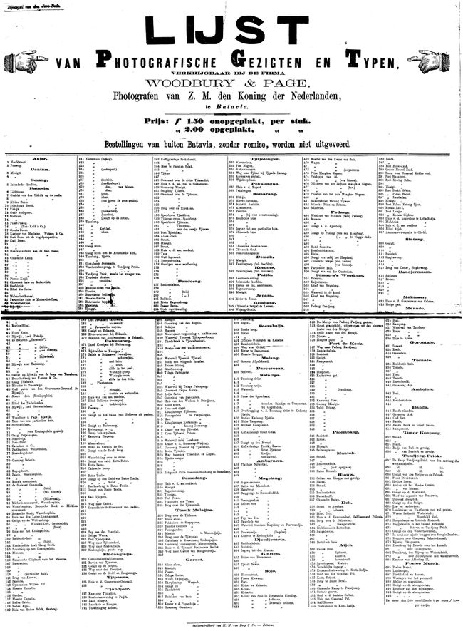 Le studio de photographie commerciale Woodbury & Page, fondé par Walter Bentley Woodbury (1834-1885) et James Page (1833-1865), a été l’un des premiers à saisir la réalité de l’industrie extractive dans les Indes orientales néerlandaises. Le studio faisait souvent de la publicité pour ses services par le biais de journaux locaux, comme Java Bode, dans lequel il a fait paraître le 18 octobre 1879 une liste de plus de 600 photographies disponibles à l’achat. Les images représentaient, entre autres, une grande variété d’édifices emblématiques, de résidences ou d’infrastructures publiques que des paysages pittoresques, s’étendant d’Aceh à Kupang. Cette liste semble indiquer que les photographies de plantations faisaient déjà partie des nombreux visuels de collection vendus par le studio.