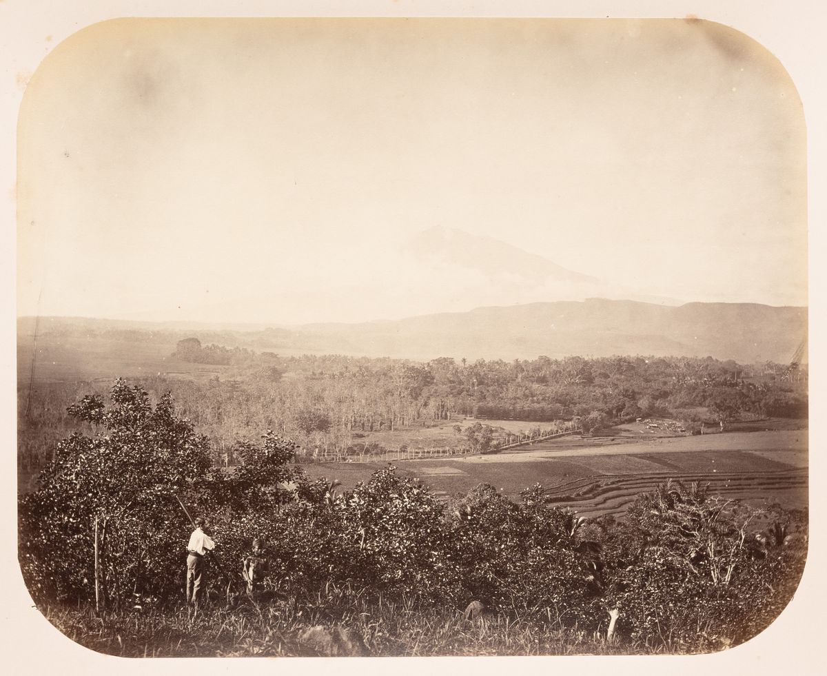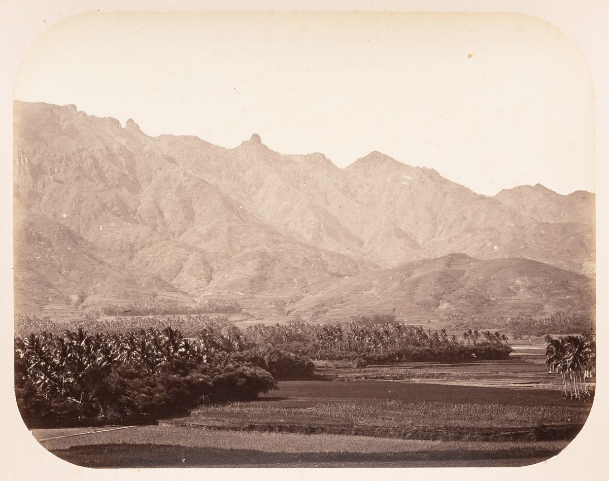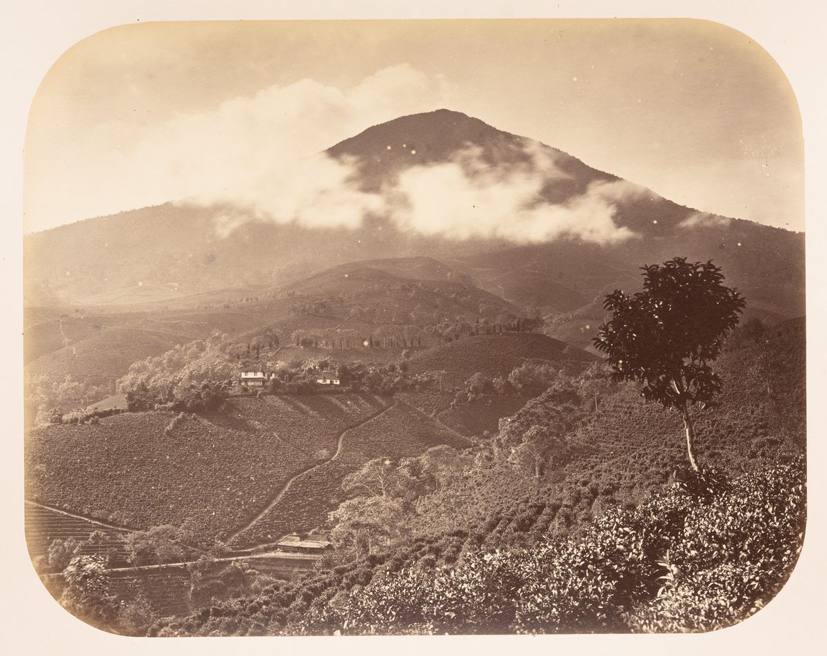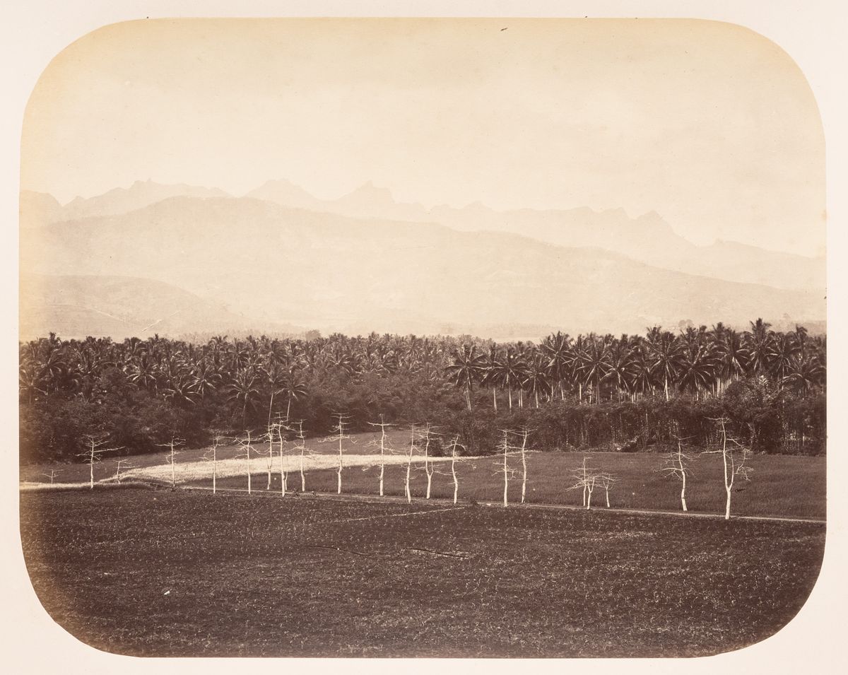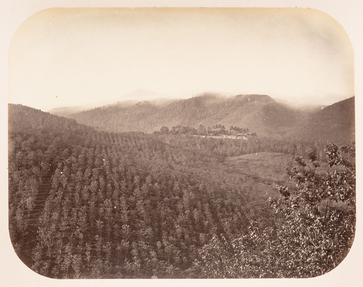 En ce qui concerne l’échelle, il y a dans un album réalisé par Woodbury & Page un geste spécifique qui retient l’attention et complique plus encore l’observation de Protschky sur les images de plantations. Le studio a principalement photographié les plantations de loin et de haut, à l’instar des peintres coloniaux qui ont produit des représentations scéniques des Indes orientales néerlandaises (un genre connu sous le nom de Mooi Indië) en romançant leurs territoires naturels et magnifiques sans vraiment saisir la réalité de leur exploitation. Bien que les grilles des plantations soient le fruit d’un travail continu, les photographies de Woodbury & Page les traitent comme des paysages pittoresques, adaptés au cadre de l’appareil photo et présentés comme des parties intégrantes de leur environnement naturel. L’échelle joue un rôle important dans ces images dans la mesure où elle rend les ouvriers agricoles travaillant sur les plantations invisibles ou visuellement insignifiants.