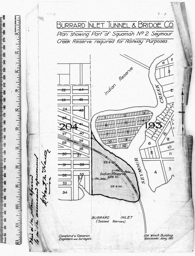 « Burrard Inlet Tunnel & Bridge Co, Plan showing part of Squamish No. 2 Seymour Creek Reserve required for railway purposes », janvier 1911. 78903/45, Bibliothèque et Archives Canada.