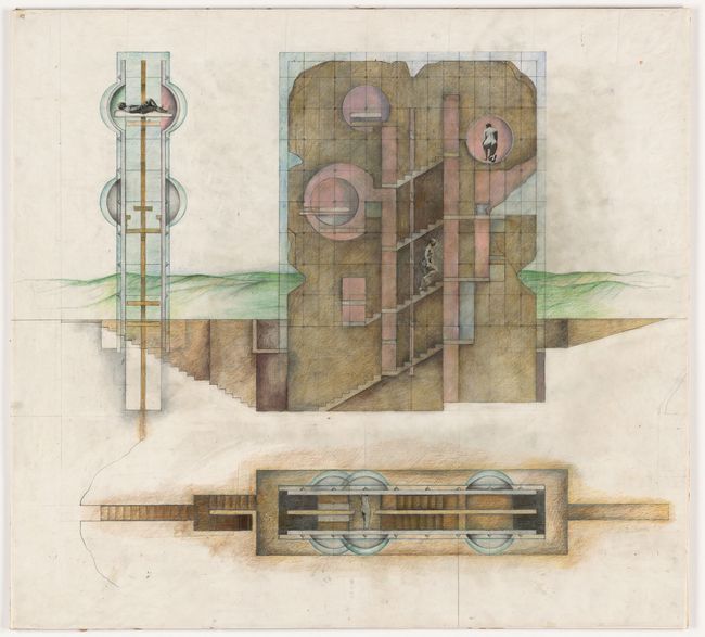 Raymund J. Abraham (1933-2010), The House without Rooms Project, élévation et plan, 1974. Crayon de couleur, graphite et papier imprimé découpé et collé sur papier, 87,9 x 96,8 cm. Image numérique © The Museum of Modern Art, New York. Don de la Fondation Howard Gilman. Licence accordée par SCALA/Art Resource, NY. Succession de Raimund Abraham.