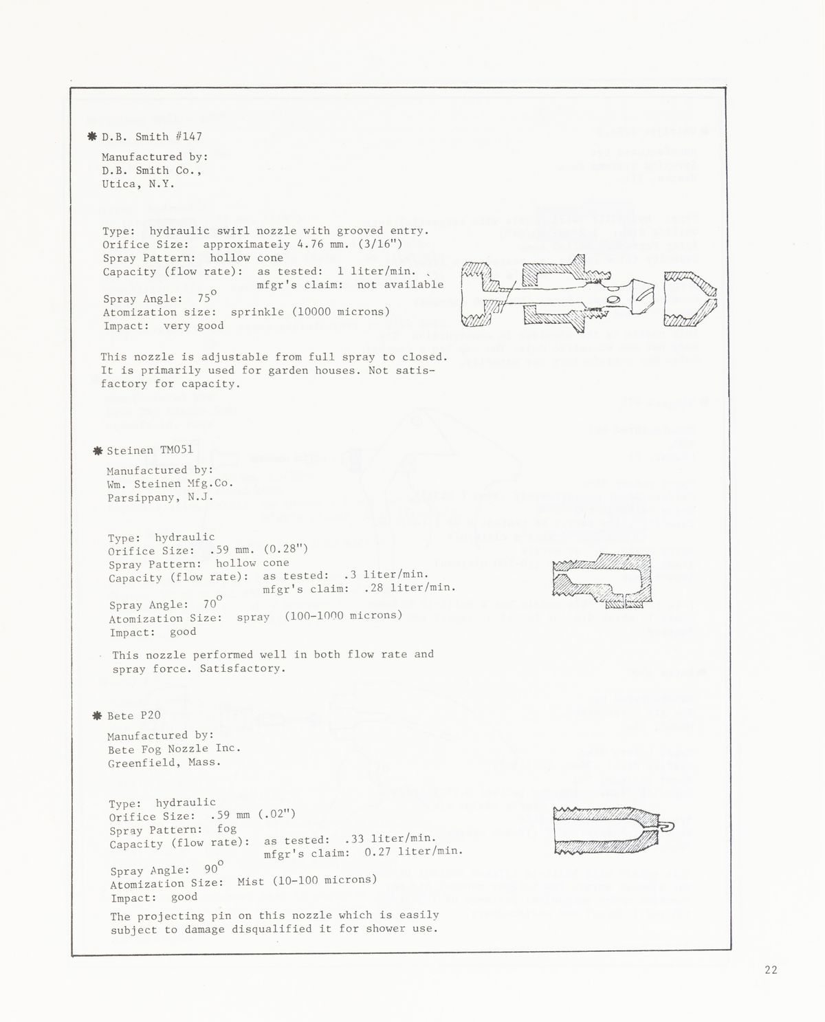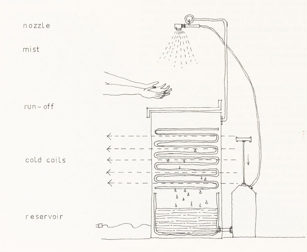 Le brumisateur atomise l’eau en dirigeant un flux d’air rapide sur un tube d’eau vertical. La différence de pression entre le récipient d’eau et le courant d’air force l’eau à se disperser en petites gouttelettes. Le groupe de travail sur le logement à coût minimal a étudié une gamme de pulvérisateurs fabriqués en série et destinés à l’agriculture, au jardinage, à la peinture et aux produits de nettoyage. Ces produits sont apparus sur le marché dans le sillage de la conception d’un « pistolet à brouillard » par Buckminster Fuller, brevetée en 1938, qui faisait partie d’une conception de salle de bains préfabriquée commandée par la compagnie minière de cuivre Phelps Dodge1. À la fin des années 1940, Fuller a poursuivi ses expériences à l’Institut de design de l’Institut de technologie de l’Illinois et à l’université de Yale sur les effets thérapeutiques de bains massant d’une heure utilisant de l’eau sous pression et des lampes chauffantes. Avant de co-fonder le Minimum Cost Housing Group au début des années 1970, Alvaro Ortega avait vu l’utilisation de pulvérisateurs de pesticides pour le lavage par brouillard dans le Proyecto Experimental de Vivienda (PREVI), un projet de logements sociaux à Lima, au Pérou2.