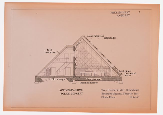 De Paoli & Pellissier, Tree Breeders Solar Greenhouse (Serre solaire pour l’élevage d’arbres), Institut forestier national de Petawawa, Chalk River, Ontario, 1977. Encre noire et film adhésif sur papier translucide, 47 x 66 cm. ARCH279071, Fonds Giovanni de Paoli et Pierlucio Pellissier. Don de Pierlucio Pellissier © CCA.