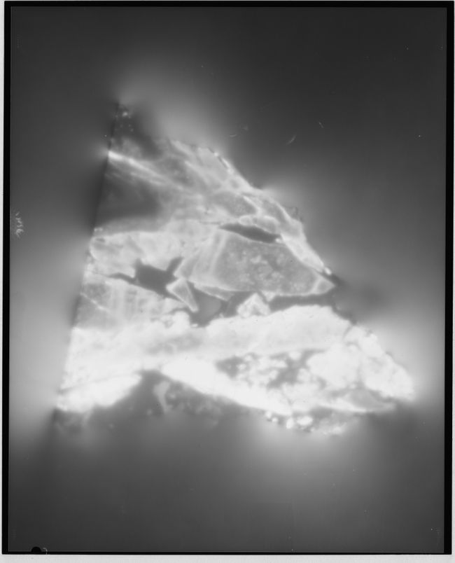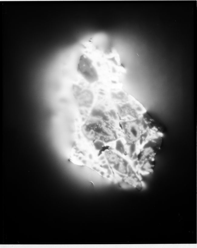 Mon approche m’amène à repenser la définition du document. La photographie ou les débris photosynthétiques accrochés à la semelle de ma chaussure ou à mes ongles constituent-ils le document à proprement parler? Dans mon travail, je pense que le documentaire rassemble différentes façons de témoigner de ces paysages et des histoires racontées à leur sujet pour générer une image multidimensionnelle. Lorsque vous collaborez avec une roche radioactive, qui est à l’œuvre? Je facilite le contact entre le film analogique et la roche radioactive pendant un certain temps dans la chambre noire ou la cave d’un musée; la roche s’occupe du reste. Dans ce cas, qui est l’autrice? Parfois, mes tests prennent quarante-huit heures, ou une semaine, ou plus de cent jours, mais la roche « fait » de la radioactivité depuis aussi longtemps que la terre existe – qu’est-ce que cela signifie d’enregistrer un minuscule moment dans la vie de cette roche?