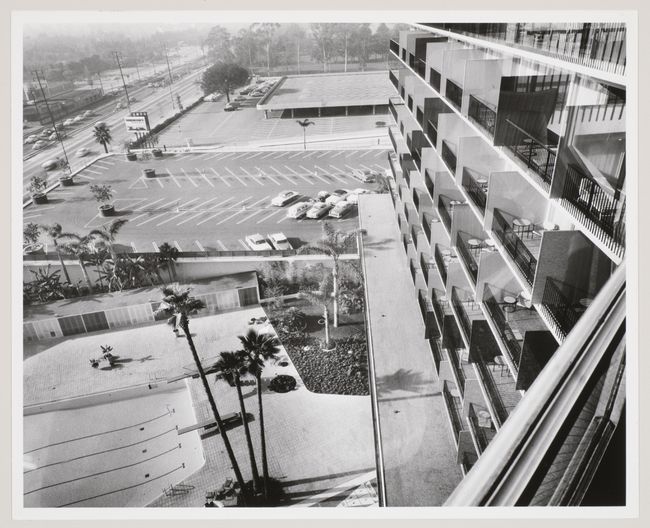 Julius Shulman, Vue partielle de la façade, du parking et de la piscine de l’hôtel Beverly Hilton, Beverly Hills, Californie, É-U (conçu par Welton Becket and Associates), 1952-1955. Tirage gélatino-argentique. PH1998:0080:003, CCA. Don de Elliott et Carolyn Mittler © J. Paul Getty Trust