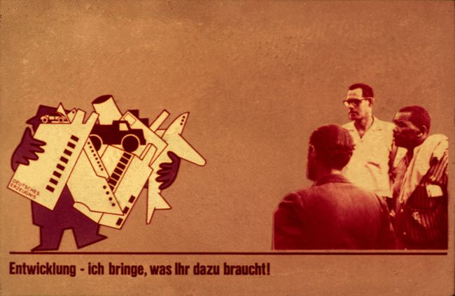 « Développement, je t’apporte ce dont tu as besoin! » Conservée dans les « diapositives de référence » du fonds Georg Lippsmeier et Institut für Tropenbau au CCA, cette image montre un personnage anonyme, fort probablement un expert allemand, proposant des technologies basées sur le carbone aux populations des nouveaux États d’Afrique. Usines, centrales électriques, avions, voitures et bateaux – tous estampillés « Produits allemands » – donnent une idée du rôle joué par l’importation de technologies à base de combustibles fossiles dans le développement des régions en émergence. Ces technologies de progrès industriel vont bouleverser à tout jamais les environnements naturel et bâti des pays en développement partout sur la planète.
