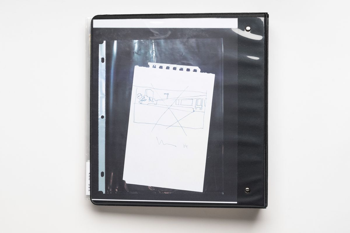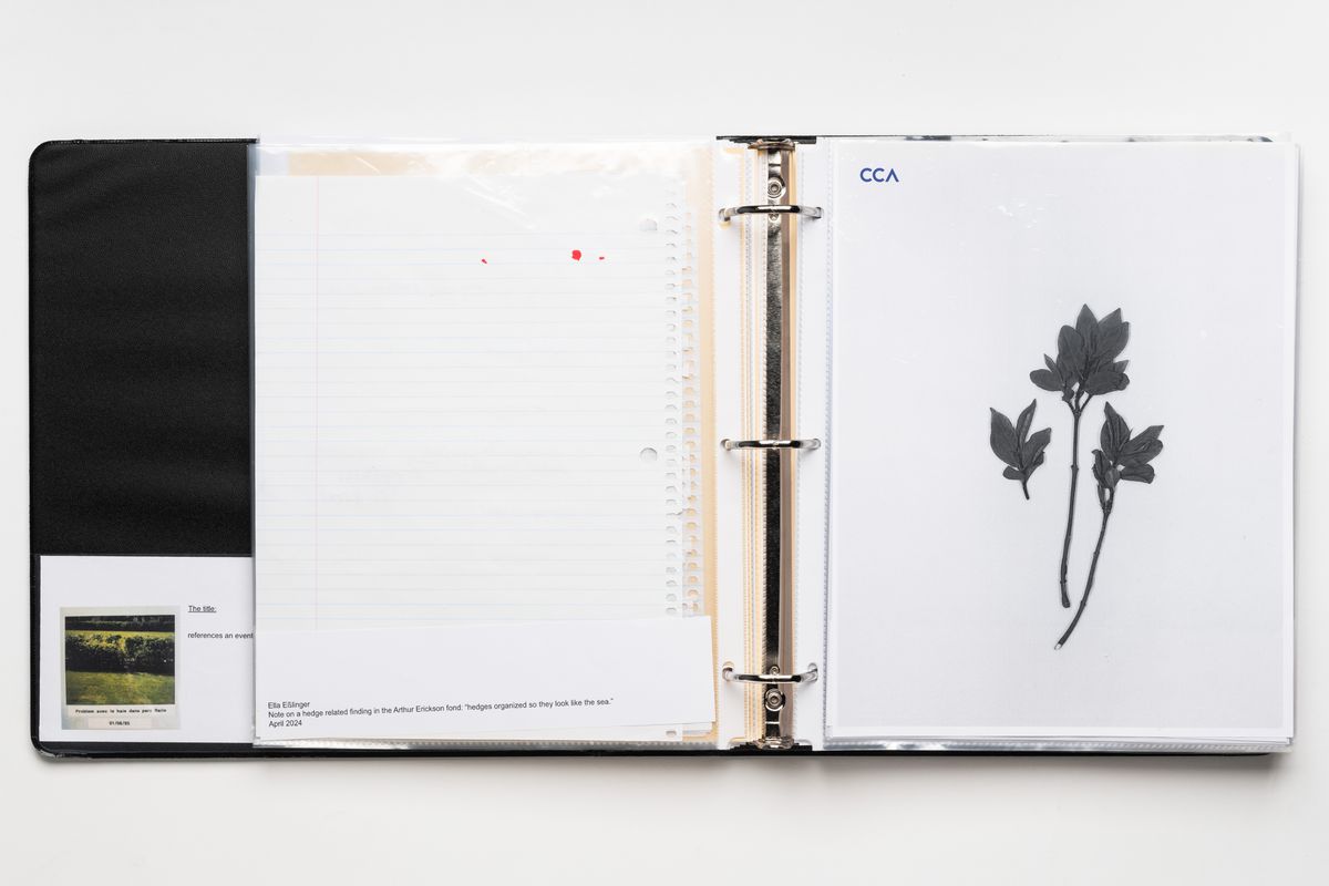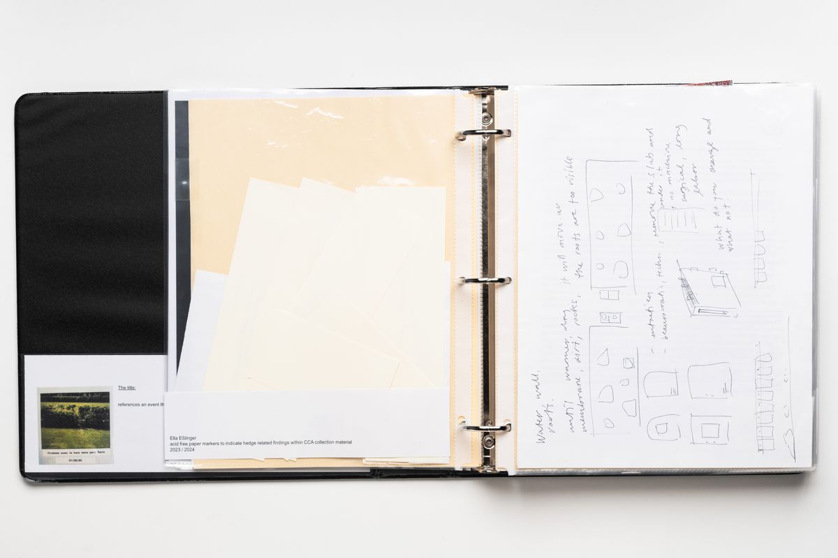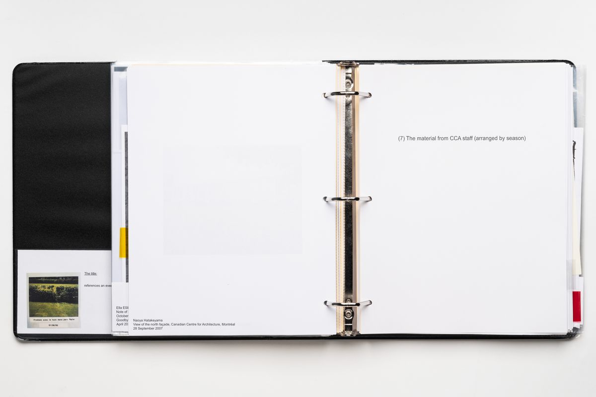 Au cours des derniers mois, la haie du CCA m’a servi de miroir pour accéder au Centre, à sa collection et à son fonctionnement interne et les comprendre, alors que j’ai entrepris une recherche d’investigation — ou plutôt une re-cherche — pour découvrir et en même temps situer la modeste haie au sein de l’institution dans son ensemble, pour en apprendre plus sur son milieu, son habitat naturel. J’ai aimé l’idée qu’un objet physique — original, relié à l’architecture, au contraire d’un mot-clé abstrait — puisse servir de filtre aux vastes archives à travers lesquelles il est possible de récupérer des informations. J’ai entrepris de constituer un classeur en notant les renseignements au fur et à mesure qu’ils s’accumulaient. Schématiquement organisé en dix catégories, il comprend divers documents provenant des archives du CCA, du personnel du CCA et de personnes non affiliées au CCA : archivistes, bibliothécaires, réviseurs, préposés à l’entretien, décideurs, photographes et architectes ont été de précieux alliés. Après une présentation du matériel trouvé dans la salle d’étude, le dossier a été acquis par la collection de la bibliothèque du CCA. En vue de cet article, le matériel pertinent concernant la haie a été numérisé et mis en circulation. Le recueil produit ne décrit pas seulement les pratiques d’archivage et de travail conçues par le CCA, mais se réinscrit lui-même dans ces pratiques.
