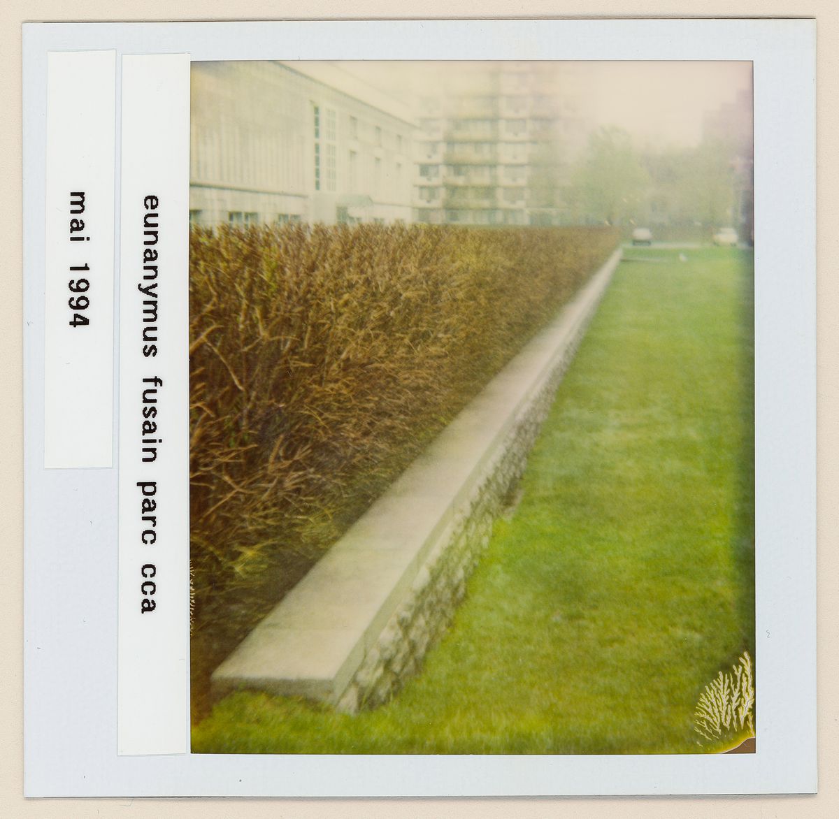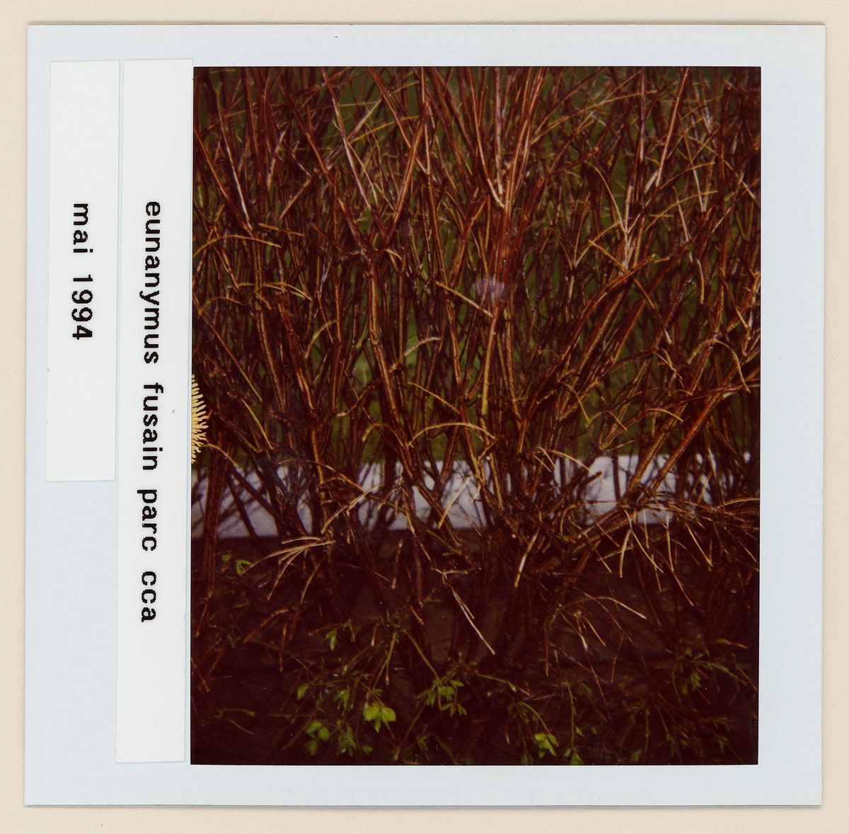 En 1988, afin de mieux comprendre le site, Claude Cormier et Judy Gorton ont préparé un rapport préliminaire sur le paysage qui a identifié trois périodes historiques d’association de plantes sur les terrains du CCA : les plantes indigènes, les plantes introduites par les colons européens et les cultivars (espèces génétiquement modifiées pour produire des caractéristiques particulières). Un volume relié répertoriant les espèces d’arbres susceptibles d’être sélectionnées pour les jardins du CCA a été créé afin de permettre un choix approprié. On ne sait pas qui est à l’origine de ce livre en forme de collage contenant des tirages électrophotographiques sur papier montés avec des photographies en couleurs découpées, mais le ton subjectif des brèves descriptions est surprenant. Pour la haie, il semble que l’auteur de la compilation ait fondé son choix d’Euonymus Alatus, généralement connu sous le nom de fusain ailé, sur la base de la couleur des feuilles et de sa propagation, en plus de ses très bonnes qualités générales et de sa résistance, écrivant : « La couleur automnale est généralement d’un rouge brillant. L’un des arbustes aux couleurs automnales les plus constantes, rarement décevant. Semble se colorer aussi bien dans le Midwest que dans les États de l’Est », ajoutant plus loin : « J’ai obtenu chaque fois un taux de succès de 100 % avec cette espèce et ce cultivar! »