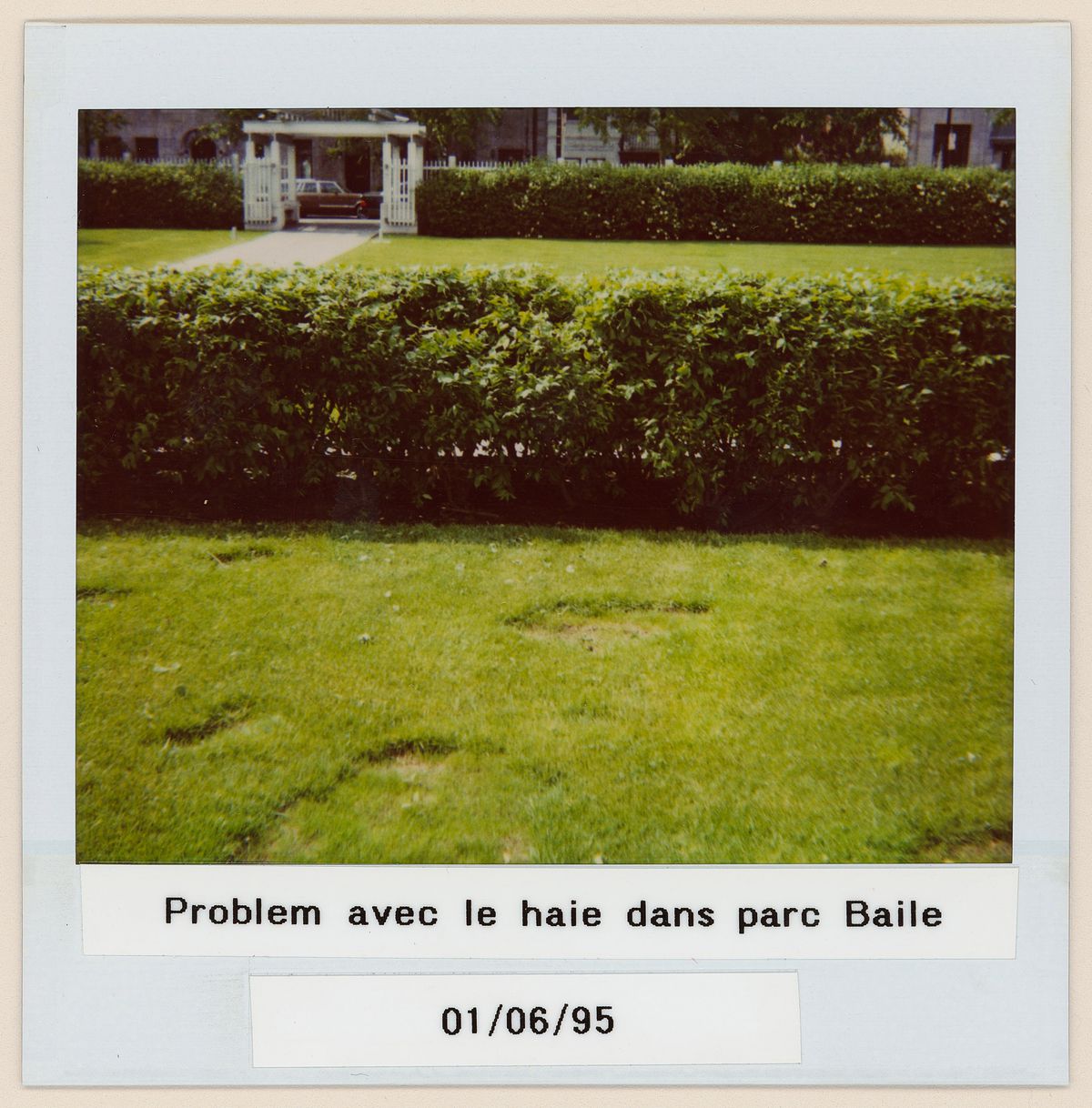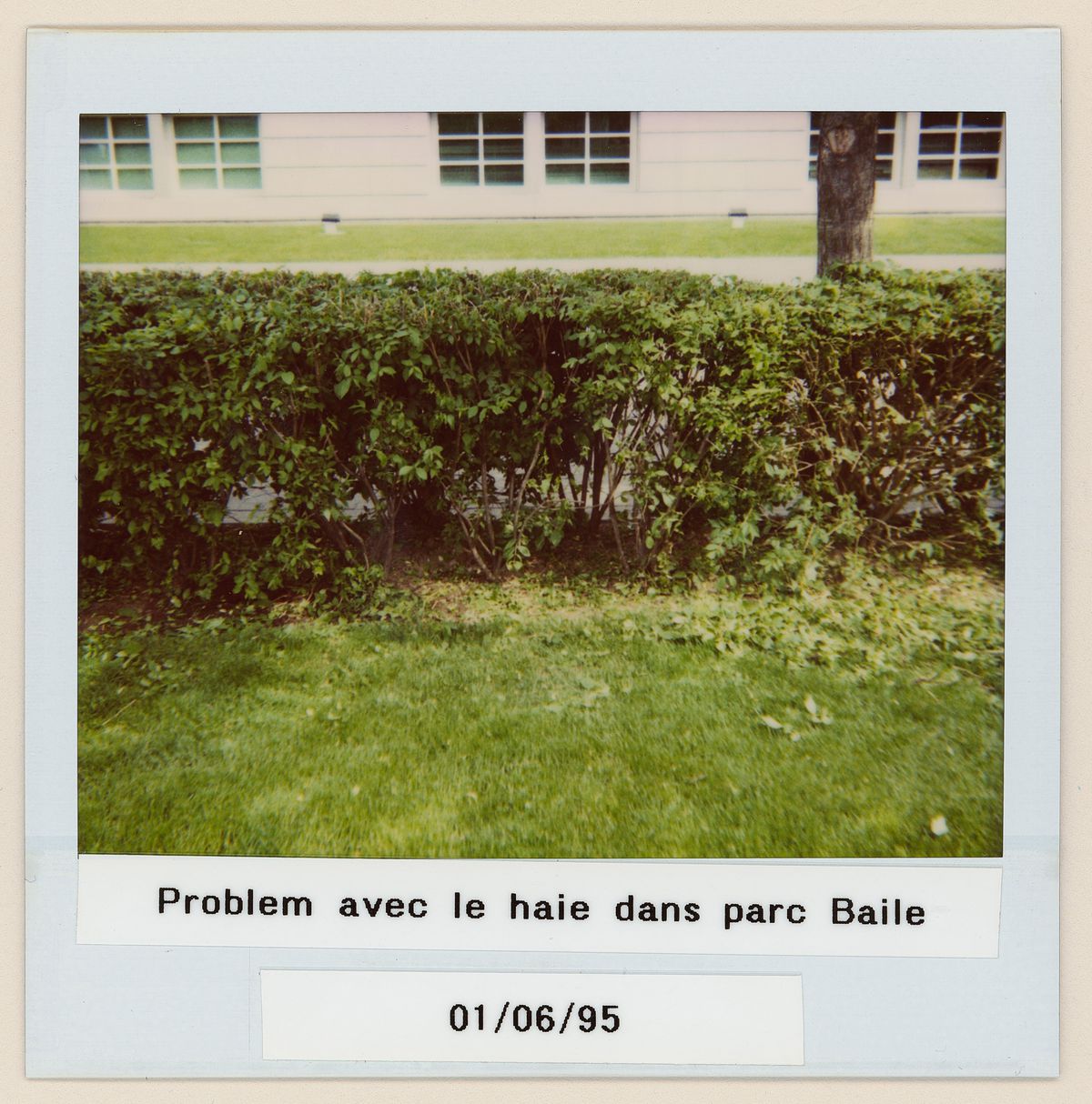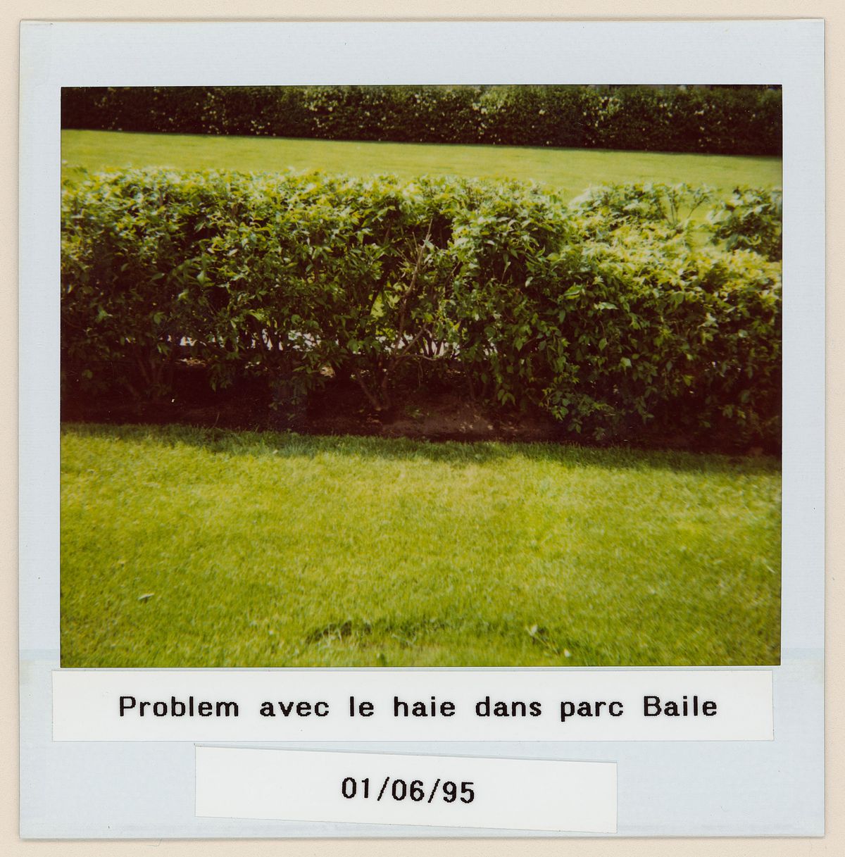 Outre les documents plus techniques et descriptifs tels que la correspondance entre le CCA et son architecte paysagiste Claude Cormier, des résumés d’activités quotidiennes, des procès-verbaux de réunions, des analyses, des rapports et des plans concernant l’entretien et l’aménagement paysager (notamment le système d’irrigation, le drainage et la fertilisation, l’application d’herbicides et de pesticides), un grand nombre de photographies étiquetées documentent les problèmes de la haie survenus en 1995. Des polaroïds rangés dans des pochettes en plastique semblables à celles d’un album photo montrent comment la haie semble fragmentée en certains endroits, avec des trous dans sa longueur totale.