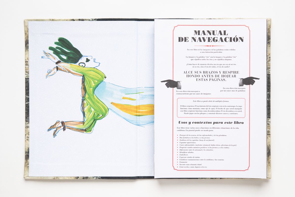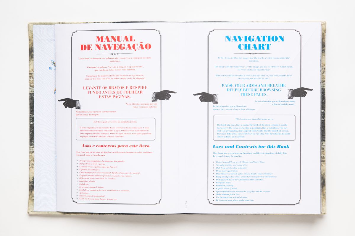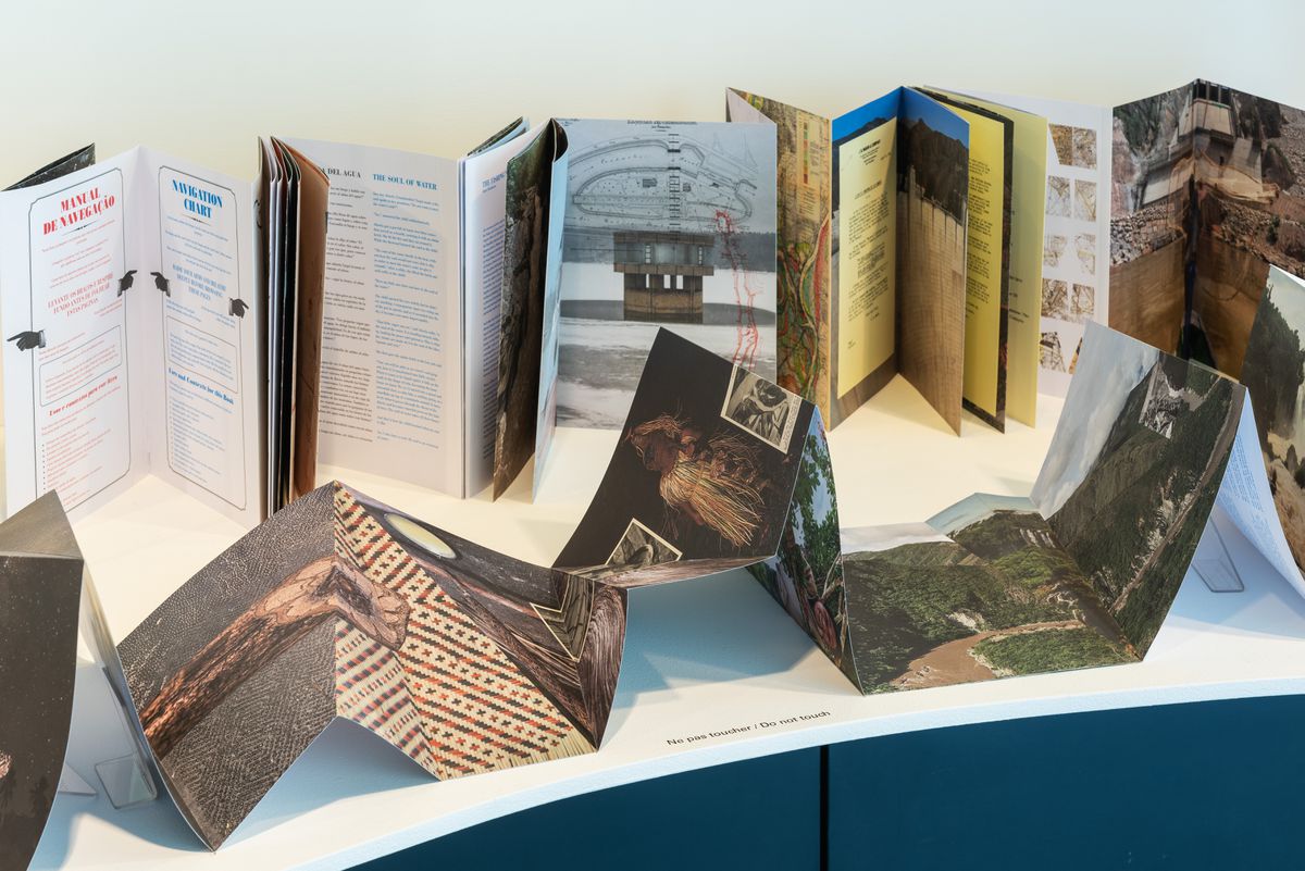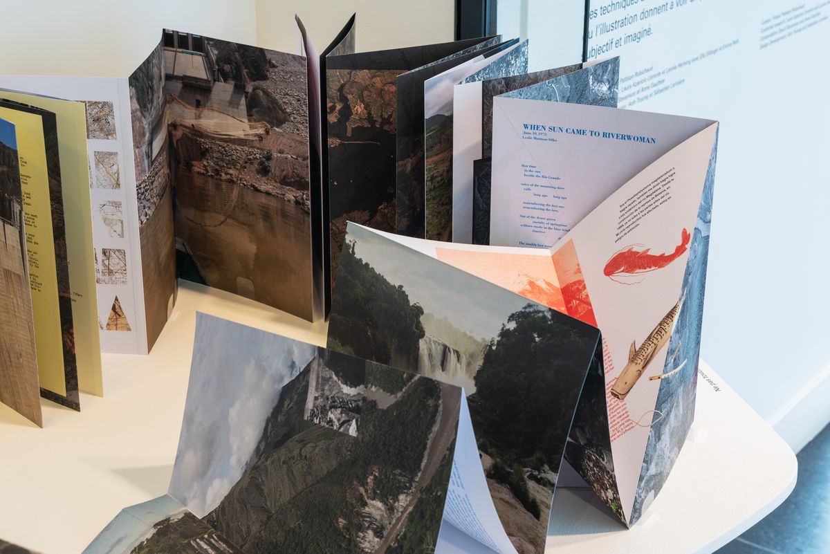 Le Serpent River Book, de Carolina Caycedo, se déploie en une œuvre de soixante-douze pages ressemblant à une rivière sinueuse. Le livre double face combine matériel d’archives, cartes, poèmes, paroles de chansons, images satellites, textes et photographies rassemblés par Caycedo dans le cadre du projet de recherche en cours, Be Dammed. Étudiant les incidences des industries extractives sur les paysages naturels et sociaux, l’artiste présente, sous forme de collages, les multiples significations culturelles des cours d’eau.