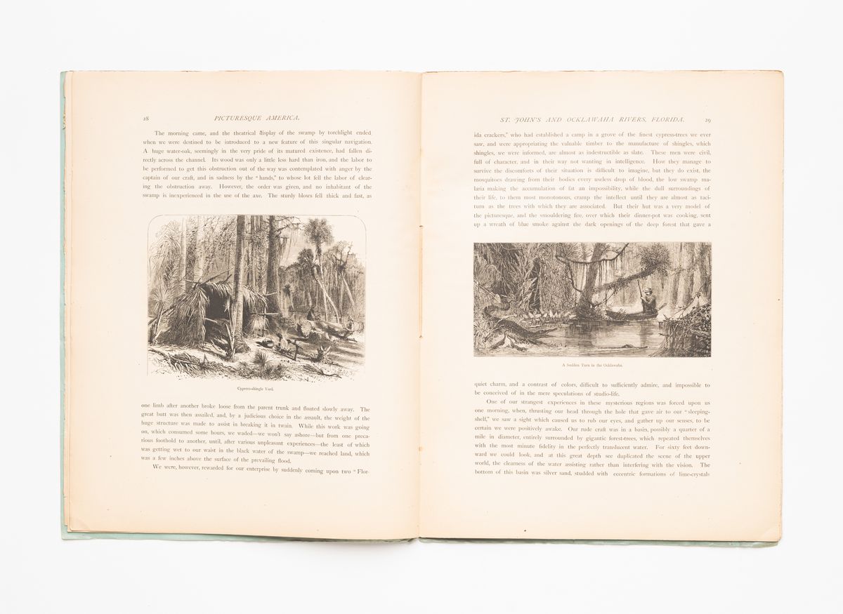 D’abord publié comme un périodique illustré dans l’Appleton’s Journal et plus tard sous forme de livre par abonnement par D. Appleton and Co., Picturesque America, avec ses quarante-huit numéros, était livré deux fois par mois et pouvait être relié en un volume en deux parties une fois la collection terminée. À terme, il comptait plus de neuf cents gravures sur bois et cinquante sur acier, accompagnées de textes descriptifs. À l’époque, ce type d’illustrations était relativement abordable, ce qui permettait une diffusion plus large auprès du public. Les gravures étaient également plus faciles à composer et à manipuler que les photographies; tout ce qui ne correspondait pas à l’esthétique pittoresque – pollution industrielle, pauvreté des agriculteurs ou communautés autochtones – était mis de côté. Des publications équivalentes, dont Picturesque Canada (1882), Picturesque Europe (1875) et Picturesque Palestine, Sinai, and Egypt (1881-1883) ont plus tard été réalisées à travers le monde.