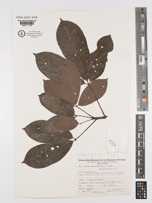 Holotype de Hevea brasiliensis (caoutchouc), Jardins botaniques royaux, Kew. CC-BY 4.0