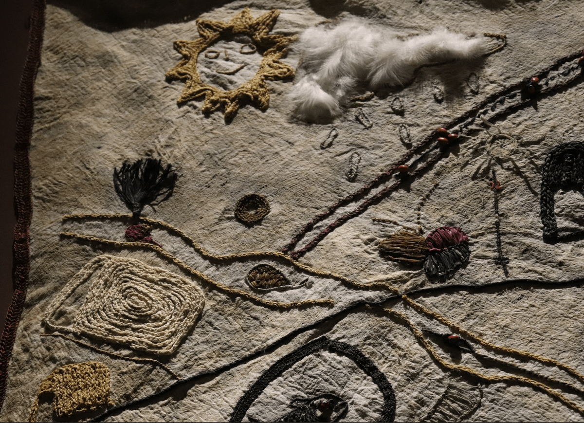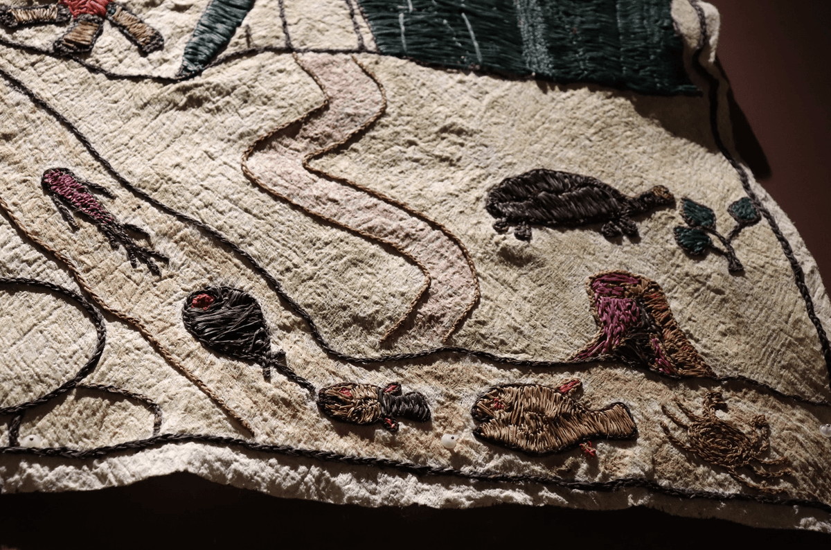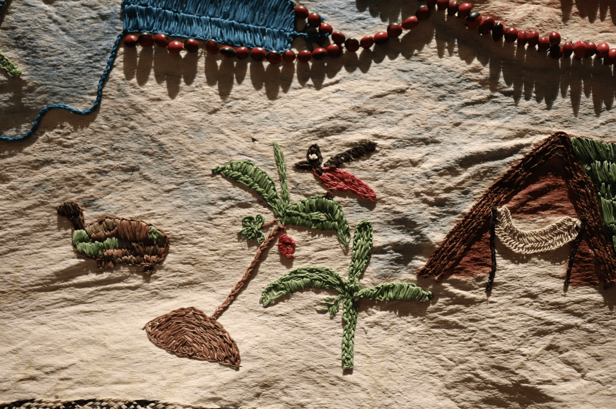 Ces dessins ont été partagés avec un collectif d’artistes Huaorani dirigé par Manuela Omari Ima. Dans la communauté de Tepapare, les femmes cultivent plusieurs variétés de kewenkore (chakra en huaorani) et de chambira kewenkore (le chambira étant le palmier dont les fibres servent à tisser des filets de pêche, hamacs et une multitude d’autres objets). Les artistes Huaorani ont choisi de représenter les villes amazoniennes étudiées en utilisant une écorce pouvant être déroulée d’un arbre connu en kichwa sous le nom de yanchama. Dans cette approche animiste de la création, la forêt se façonne d’elle-même sous de nouvelles formes et les artistes en deviennent les médiums. Ces derniers traduisent l’énergie du chambira et celle de chaque couleur en motifs uniques qui se dessinent à mesure qu’un fil forme un filet de pêche ou que la logique d’habitation des peuples d’Amazonie se brode pour restaurer les villes ancestrales au sein du cycle de la vie contemporaine.
