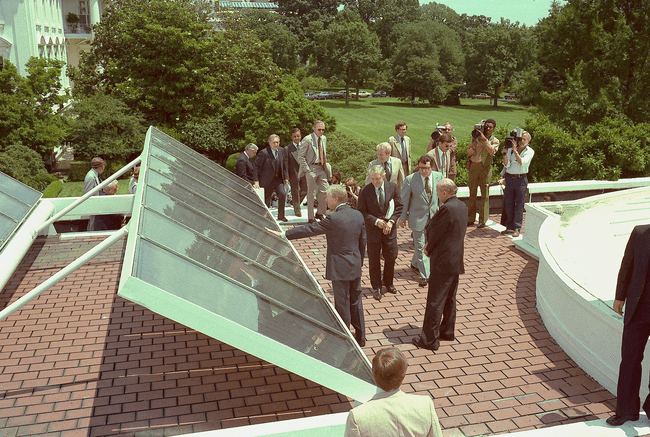 Jimmy Carter sera le premier président des États-Unis à s’engager de manière décisive dans une politique de promotion de l’énergie solaire. Formé comme ingénieur nucléaire dans les années 1950, à une époque où le nucléaire et le solaire sont perçus comme ayant le potentiel de remplacer le charbon et le pétrole, il prend résolument le parti des énergies renouvelables lors de sa présidence. Celle-ci est marquée par des gestes concrets : rédaction d’une politique de l’énergie (1977), création du Secrétariat à l’énergie (1977) et du Solar Energy Research Institute (1977), promulgation d’une loi nationale de l’énergie (1978) et célébration de la première journée nationale du Soleil (3 mai 1978)1.