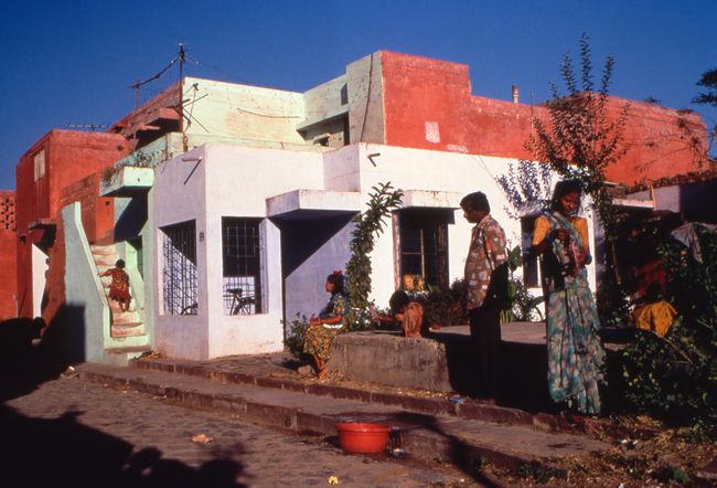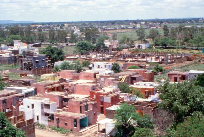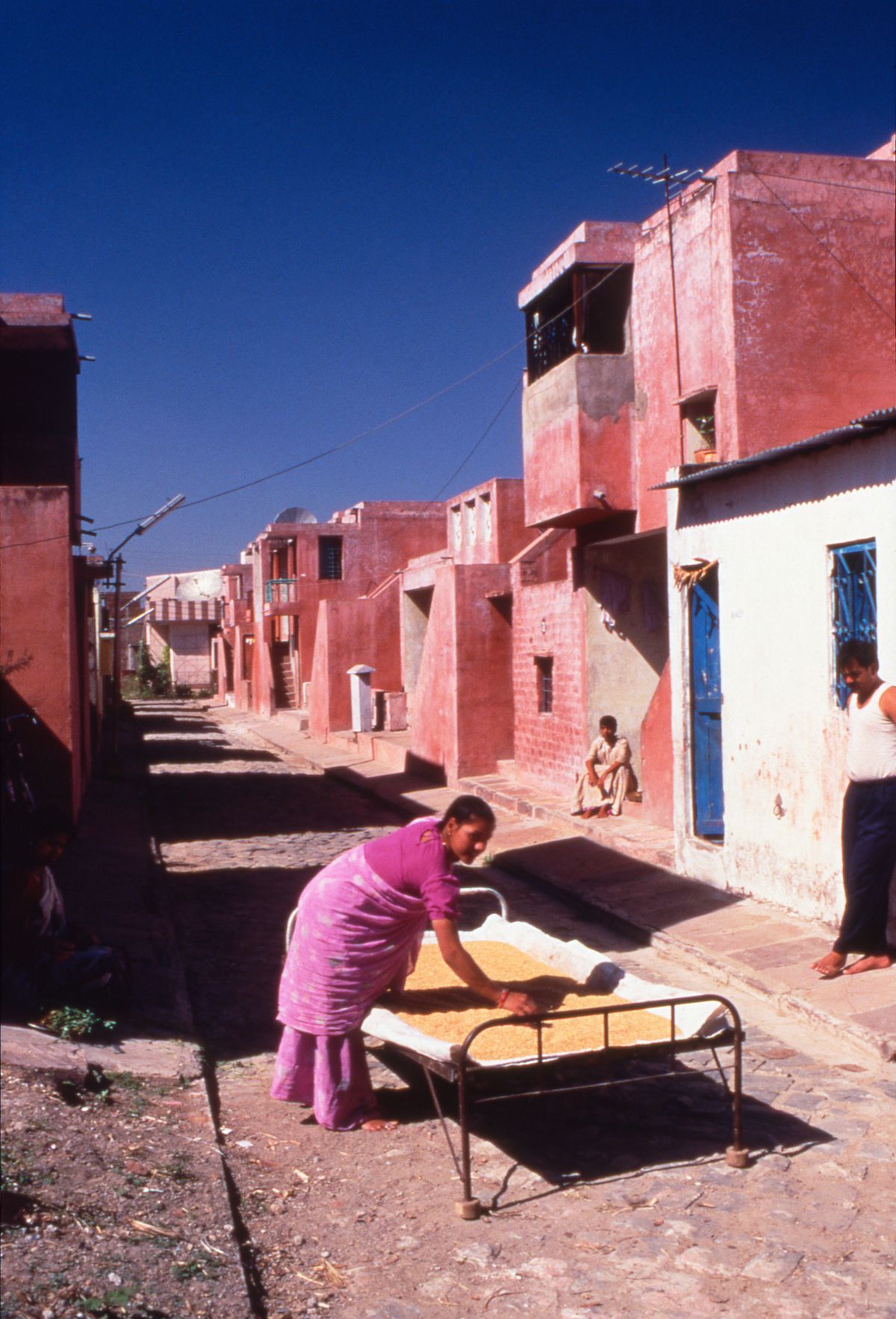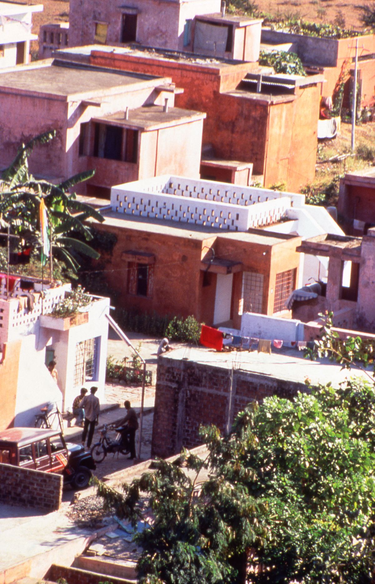 L’approche que Doshi a préconisée pour Aranya incarnait l’esprit du sthapati-architecte en cela que sa conception répondait aux besoins et aux capacités de ses utilisateurs de la façon la plus humble et empathique possible. Situé en périphérie immédiate d’Indore, Aranya a été pensé comme un village plutôt qu’un simple projet d’habitation dont le but serait de pallier le manque aigu de logements en ville, particulièrement pour les gens vivant dans des quartiers informels. Des 6500 parcelles planifiées, 65 pour cent ont été réservées pour ce que le gouvernement indien a qualifié de la partie économiquement vulnérable de la société (à l’époque, ces terrains mesuraient trente-cinq mètres carrés et étaient destinés aux ménages gagnant trente-cinq dollars par mois), le reste étant mis sur le marché pour les résidents à plus hauts revenus. Pour pouvoir réserver une telle proportion de parcelles à une clientèle à bas revenus tout en préservant un développement viable d’un point de vue économique, Doshi a choisi une approche de planification de type « trames d’accueil », qui assurait des infrastructures de base de grande qualité sur lesquelles les résidents organisaient leur logement, qu’ils pouvaient améliorer avec le temps. L’architecture d’origine se composait de blocs techniques comprenant plomberie, approvisionnement en eau, électricité et accès routier, ainsi que des plateformes et cuisines que les habitants pouvaient agrandir et aménager au fil du temps et des ressources disponibles. Prévu pour une population de 70 000 personnes, Aranya s’est depuis développé pour en accueillir approximativement 80 000, montrant à quel point Doshi avait vu juste quant à la croissance future possible du nombre de logements individuels et du quartier et, par extension, de l’implantation dans son ensemble.