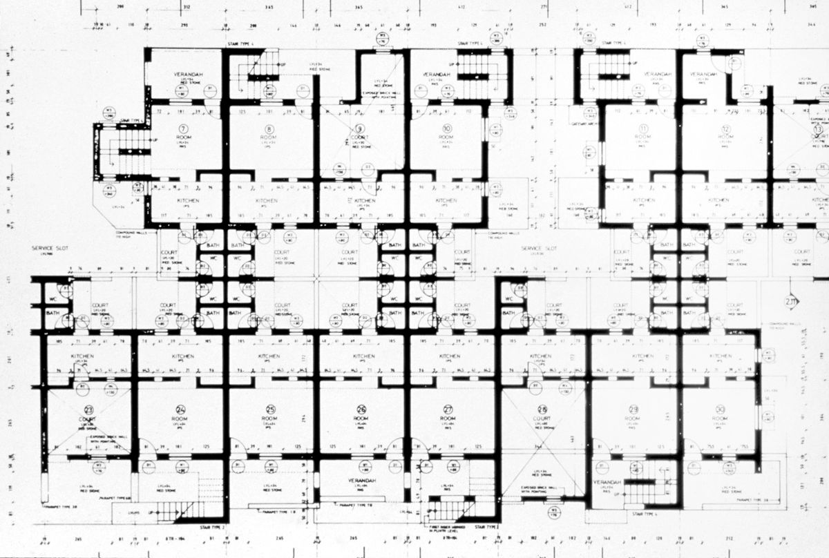 Minimum Cost Housing Group et Vastushilpa Foundation. Étude des espaces ouverts conçus pour encourager l’activité économique autour des habitations, logements sociaux d’Aranya, Indore, Inde, 1990. Fonds Minimum Cost Housing Group, CCA. ARCH280276