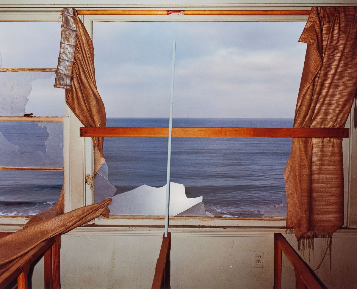 Le site, un bungalow de plage, illustre le criant besoin de terrains à bâtir typique de cette portion de la côte ouest américaine. Des maisons étaient construites – et continuent de l’être – sur des terrains improbables, menacés par les inondations, les tremblements de terre, les coulées de boue, les feux de broussailles, et ici, de l’érosion côtière. Fasciné par les manifestations de ce type d’excès, le photographe commença l’exercice au départ avec le simple souci de documenter cette destruction. À l’époque de la prise de vue, le photographe ne disposait pas d’un studio et avait donc l’habitude d’emmener son appareil sur des propriétés à l’abandon qui, très vite, remplirent ce rôle par substitution. De là, il était logique de commencer à intervenir dans ces espaces et de transformer le « studio » en sujet. À mesure de la progression de cette série, le désir d’intervenir dans l’espace et d’avoir une plus large influence sur l’œuvre se fait plus fort et rejoint vite des concepts comme le vandalisme et la création. Ces extrêmes créent une tension dans cette photographie, exacerbée par la brutalité et l’artificialité de l’éclairage de l’intérieur au flash en contradiction avec le calme de la mer sous le soleil à l’extérieur. Les bords acérés des éclats de verre sont à la fois réfléchissants et transparents. Le bâton bleu, probablement un objet trouvé, apporte un mouvement vertical bien que peu marqué puisqu’il disparaît pratiquement devant le ciel, créant ainsi un autre genre de tension qui vient de l’ambiguïté de sa position autant que la signification du mouvement qu’il crée.