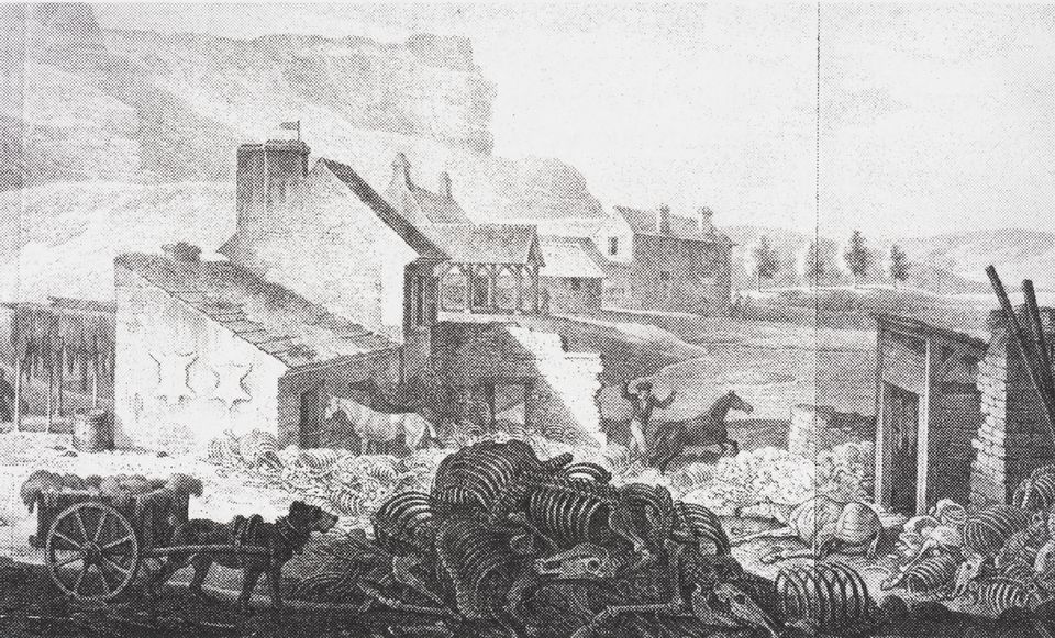 L’atelier d’équarrissage de Dussaussois à Montfaucon, Paris, Jean-Gabriel-Victor de Moléon, Recherches et considérations sur l’enlèvement et l’emploi des chevaux morts, 1827, pl. 12. Reproduit dans André Guillerme, La naissance de l’industrie à Paris: entre sueurs et vapeurs, 1780-1830, 2007, p.118
