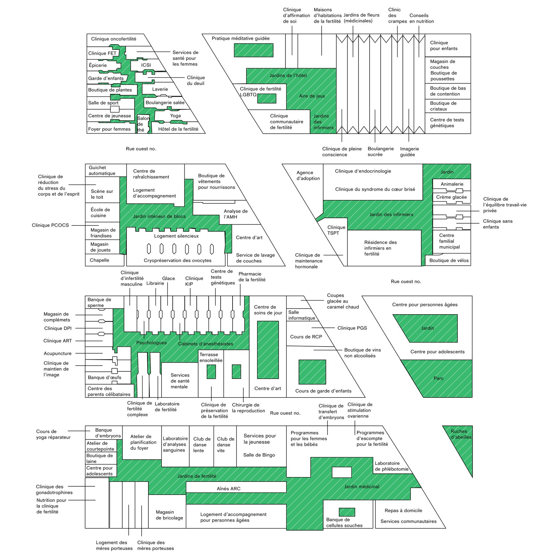 Cette carte réinvente la forme et la vie d’une ville à travers tout ce qui a trait à l’infertilité et à la fertilité, des tests et des traitements, au maintien de la vie sociale. Comme la société considère toujours les problèmes de fertilité comme des questions privées, la sensibilisation ne se fait que par le biais de ceux qui les vivent ou les ont vécus. Les traitements entrepris dans les institutions que sont les hôpitaux et les cliniques spécialisées, ou dans l’intimité des foyers, restent privés, ce qui rend la démarche de traitement secrète, éventuellement taboue, et incomprise. Afin d’éliminer la stigmatisation et de sensibiliser ceux qui n’ont pas le privilège de bénéficier de tels services, cette carte se veut détaillée mais non exhaustive. Il y a plus de services, plus de connexions sociales qui doivent être reconnus, plus de soutien à apporter aux questions sensibles de l’infertilité et de la fertilité. Cette carte met en évidence non seulement le patient mais aussi le personnel soignant, notamment les infirmiers, les infirmiers praticiens et les aides-soignants, qui sont les architectes de notre santé publique collective. Elle illustre les divers aspects des traitements de l’infertilité et des maladies qui y sont associées, et reconnaît les questions de santé liées à la mise à disposition de logements sains.