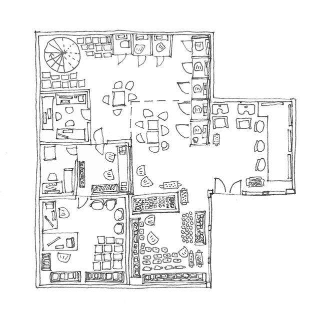 Ces dessins et retraçages cartographient ma rencontre de ces marchés1. Ils ont été réalisés sur un an, suite à des conversations sur place. Le fait de dessiner à même ces marchés a ainsi donné lieu à de nombreuses discussions et questions à propos de ma recherche avec les propriétaires résidentes et est devenu un moyen de communiquer activement les unes avec les autres2. Mon adoption des conventions architecturales du plan et de la coupe découle de ma formation d’architecte. Les dessins, plutôt que des mesures précises avec valeur légale, sont basés sur des estimations et des approximations afin de créer des archives contingentes de ces intérieurs. Le détail correspond à des visites répétées et à une lente reconnaissance de ce qui importe à celles et ceux qui vivent dans ces espaces intérieurs et qui les créent. Les dessins illustrent donc la densité d’occupation, de même que les produits vendus, le mobilier et la vaisselle – en d’autres mots, des objets du quotidien qui ne figurent pas toujours dans les dessins d’architecture, mais qui sont rendus selon les conventions de représentation qui négligeraient autrement de tels espaces, les traitant comme s’ils étaient invisibles. Le fait de dessiner ces marchés nous demande de considérer ceux-ci comme des espaces dignes d’être reproduits. Contrairement à l’accent souvent mis sur la nature improvisée des espaces réservés au commerce informel, ces formes de représentation mettent en évidence l’existence très réelle de formes physiques construites, ainsi que les possibilités spatiales et matérielles concrètes de ce qui pourrait être considéré comme ad hoc. Ces illustrations expriment dans les détails du quotidien la façon dont les gens déplacés de force créent de nouveaux nœuds spatiaux afin de surmonter l’exclusion formelle.