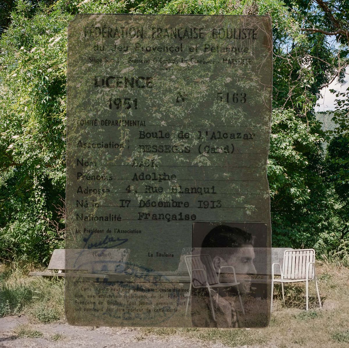 - (Arrière-plan) Sophie Bertrand, ancien boulodrome, La Grand-Combe, 2017. © Sophie Bertrand. (Avant-plan) Montage, photographie argentique et document des archives. © Archives Lack/Bertrand