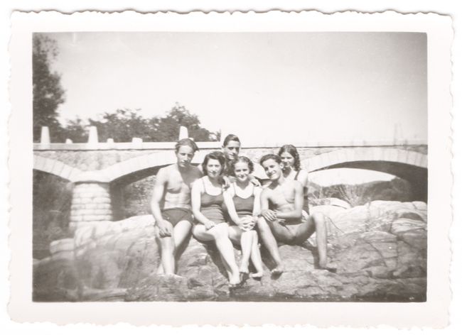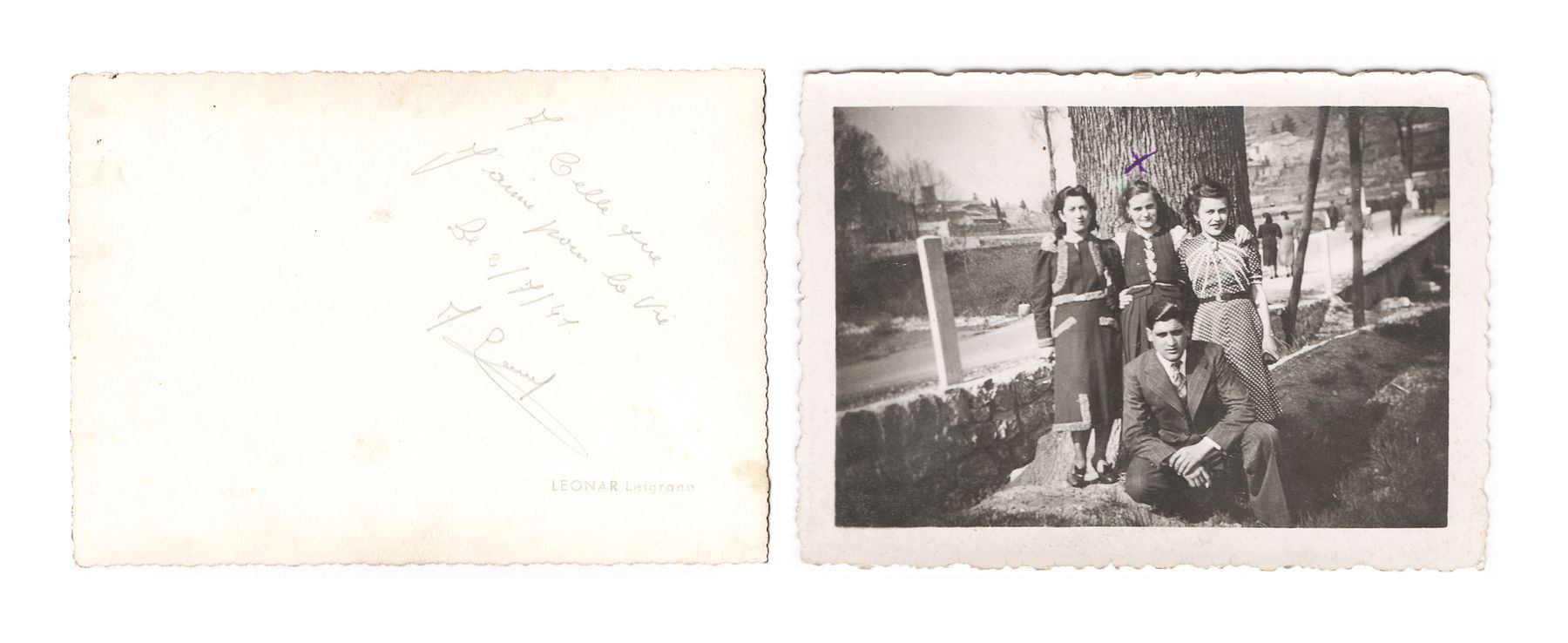 - (Gauche) « À celle que j’aime pour la vie », 2 juillet 1941, Studio Leonar Legrano. (Droite) Henriette Bouschet et des amis, région de Bessèges, n.d. © Archives Lack/Bertrand