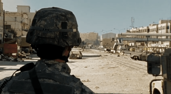 Ensuite, le bombardement de Bagdad devient toutefois le trope le plus courant. Dans le film de guerre acclamé par la critique en 2008, The Hurt Locker, l’un des innombrables longs métrages générés par les aventures militaires sans fin de l’Amérique en Irak, les scènes de tension sont centrées sur une unité de désamorçage d’explosifs de l’armée états-unienne exécutant sa mission dans ce qui est vraisemblablement la Bagdad d’aujourd’hui. Le suspense est palpable et, bien que les méchants soient censés être des guérilleros attaquant les soldats américains, les rues terrifiantes de la ville constituent en fait les principaux adversaires. Le tout est soigneusement orchestré : les routes poussiéreuses et désolées, les voitures brûlées, les structures urbaines pauvres et délabrées, les infrastructures abandonnées, telles que les voies ferrées, qui se trouvent dans des quartiers résidentiels, les panneaux en arabe qui se ternissent sous les rayons agressifs du soleil, les chèvres qui se nourrissent de déchets éparpillés stratégiquement devant la caméra et, bien sûr, les dômes et les incontournables minarets. Dans ce film, le danger ne vient pas seulement des tireurs d’élite, des engins explosifs artisanaux ou même de ces individus impénétrables qui peuplent Bagdad, dont nous ne comprenons pas le charabia et dont les visages à la peau sombre nous échappent, mais de la ville elle-même, avec son terrain accidenté et déroutant, mi-désert, mi-ghetto, où ne pourrait habiter des êtres humains attachants, mais seulement des autochtones rustres que les forces américaines bienveillantes ont pour mission de libérer et de démocratiser. Ce paysage supposé authentique de Bagdad, adossé curieusement à des collines ondulantes, a en fait été tourné en Jordanie, bien que le Maroc et le Koweït aient également été envisagés3.