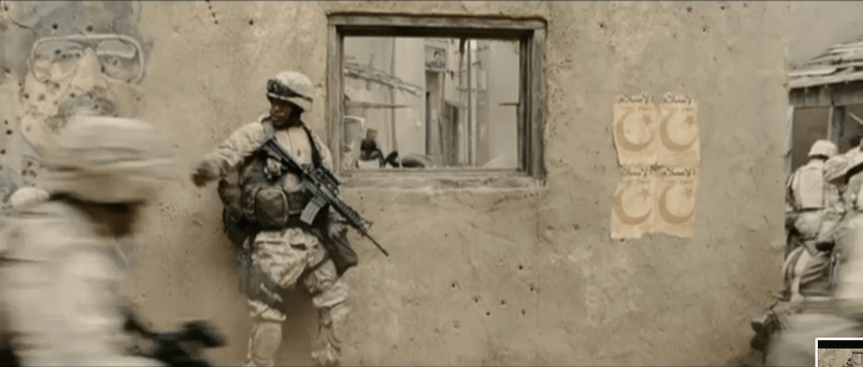 Le film Jarhead (2005) incarne les représentations récentes de Bagdad et d’autres parties instables de cette région. L’histoire se déroule en réalité à l’époque de la guerre du Golfe, et la majeure partie du scénario se situe donc dans un paysage désertique, à la frontière entre l’Irak et le Koweït (la capitale irakienne a été bombardée en 1991, et plusieurs autres frappes aériennes ont eu lieu au cours de la décennie, mais les troupes terrestres des forces alliées ne sont pas arrivées dans la ville avant 2003). Outre la manière dont le désert est présenté comme un terrain étranger où se déroulent les guerres américaines – remplaçant le trope de la jungle tropicale que l’on retrouve dans de nombreux films sur la guerre du Vietnam – une scène vers la fin du film est remarquable par l’économie avec laquelle elle montre ce qui ressemble à Bagdad. Dans un saut dans le futur sur l’invasion de l’Irak en 2003, le personnage joué par Jamie Foxx (un sergent-chef de l’armée américaine qui proclame son amour de la guerre plus tôt dans le film) apparaît au combat, ce qui laisse penser qu’il dirige les troupes vers Bagdad. Capturée furtivement, la ville est représentée par un fragment urbain : des murs beiges, décrépis, criblés de balles, ornés de peintures murales de Saddam Hussein, des affiches flétries avec des croissants – qui curieusement, et avec une admirable efficacité hollywoodienne, épellent simplement le mot « Islam » en arabe – et un véhicule militaire calciné. En fait, ce décor a quelque chose de sinistrement familier, et pas seulement parce qu’il semble si commun aux films de guerre récents : en soustrayant les soldats américains, le véhicule et l’imagerie contemporaine, on pourrait facilement imaginer le même décor utilisé comme toile de fond pour une scène de marché typique d’un film orientaliste d’époque.