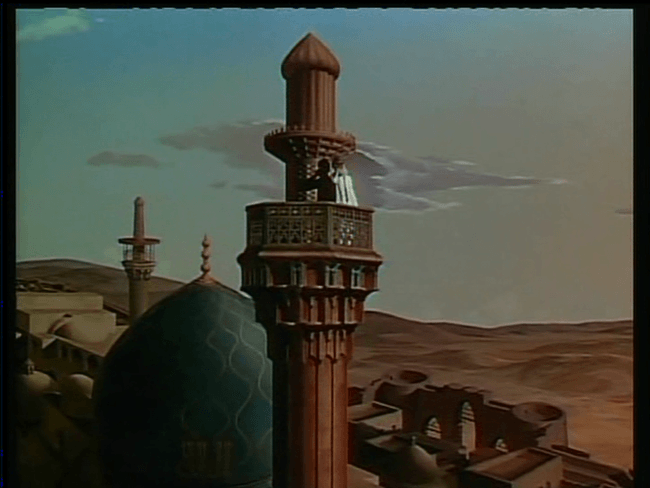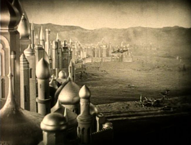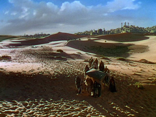 Les attributs architecturaux de ces Bagdad cinématographiques varient considérablement : certains paraissent fondés sur des exemples réels de villes emblématiques du monde arabe et musulman, tandis que d’autres sont le fruit de l’imagination débridée des personnes qui les ont créés. L’une des plus étranges concoctions se trouve dans le film de 1924 Le voleur de Bagdad, dans lequel une vue aérienne dévoile une ville dotée d’une telle accumulation de dômes en forme d’oignon et de minarets assortis que l’on a clairement l’impression que cette typologie est la seule de la ville1. Ces éléments ont vraisemblablement été choisis pour souligner l’altérité musulmane de l’Orient, en accentuant ce qui était le plus différent dans la forme urbaine de cette culture. Plusieurs films, dont Les Mille et Une Nuits de 1942, situent Bagdad comme un avant-poste isolé au sein d’un vaste désert, protégé par de hautes murailles, dont les bâtiments semblent surgir d’une enclave mystique. Bagdad était perçue par le public comme une entité spatiale lointaine et curieuse, incorporée dans et définit par un paysage inhospitalier.