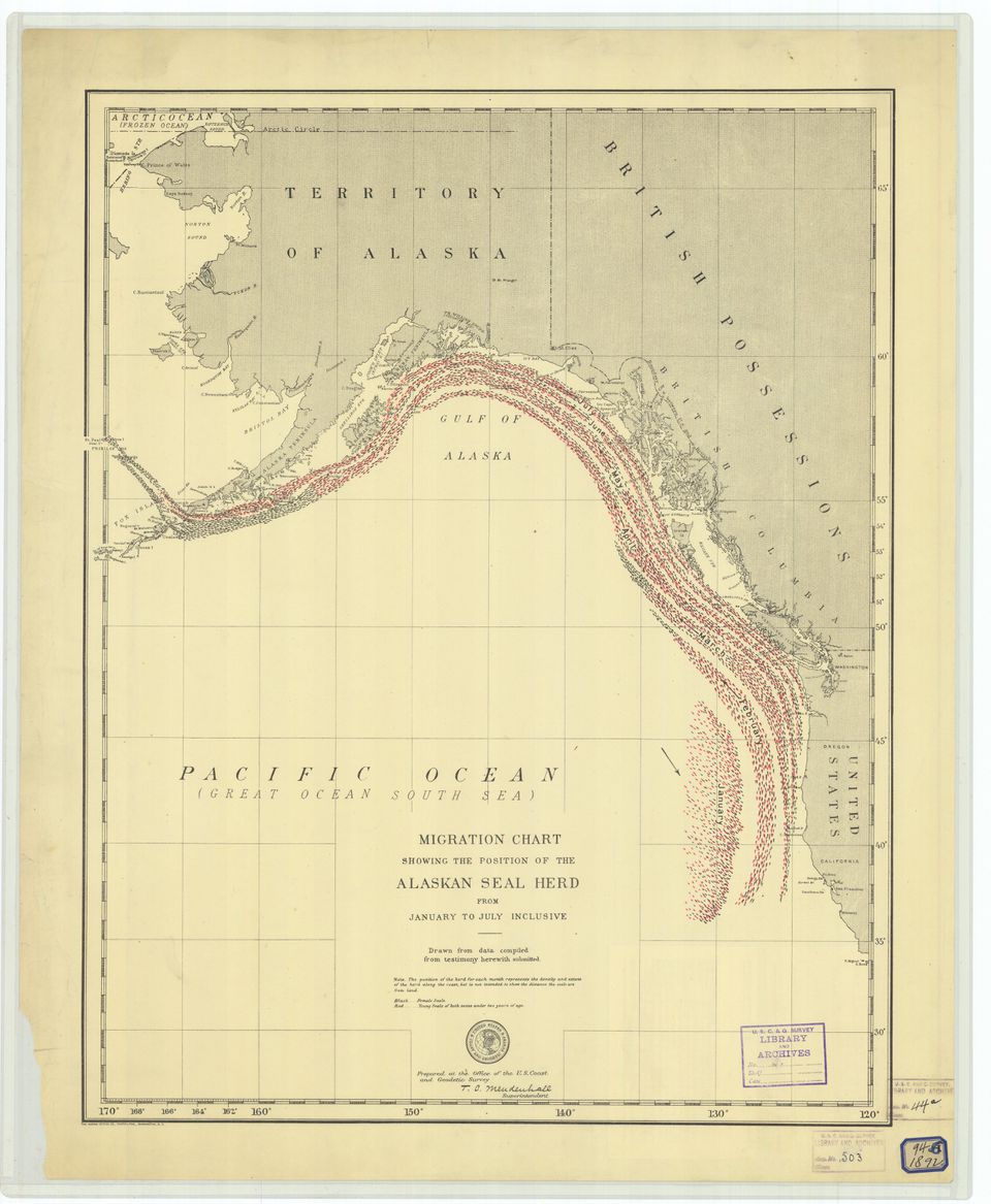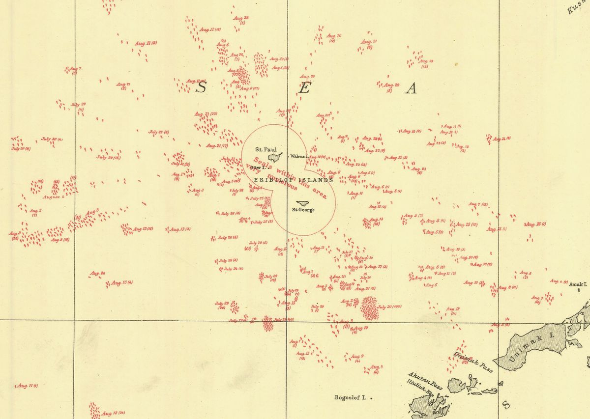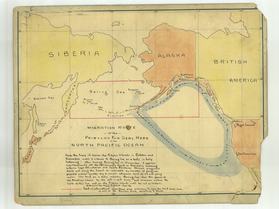 Se reproduisant en été sur les plages rocheuses des îles Pribilof, au large de la côte continentale de l’Alaska, les otaries à fourrure du Nord (Callorhinus ursinus) sont pélagiques de la fin de l’automne au printemps. Elles migrent sur de vastes étendues du Pacifique Nord, de la mer d’Okhotsk et de celle de Béring, en épousant les tourbillons des courants et des gyres océaniques. Les mâles passent l’hiver dans les eaux du nord, tandis que les femelles et les jeunes migrent vers le sud, au large des côtes de la Californie et de l’île japonaise de Honshū, sur des distances de plusieurs milliers de kilomètres. Bien que les spécialistes aient reconstitué certains fragments du monde marin de ces mammifères, on ignore encore beaucoup de choses sur leurs déplacements et leur rôle au sein des écosystèmes aquatiques1. Dans la seconde moitié du XIXe siècle, à l’apogée du commerce de la fourrure, le mystère de leur migration est devenu une ressource et un instrument de délimitation territoriale pour l’empire des États-Unis. Le pistage de l’otarie à fourrure a permis de définir la portée impériale sur le plan spatial et juridique.