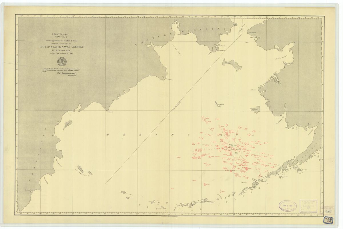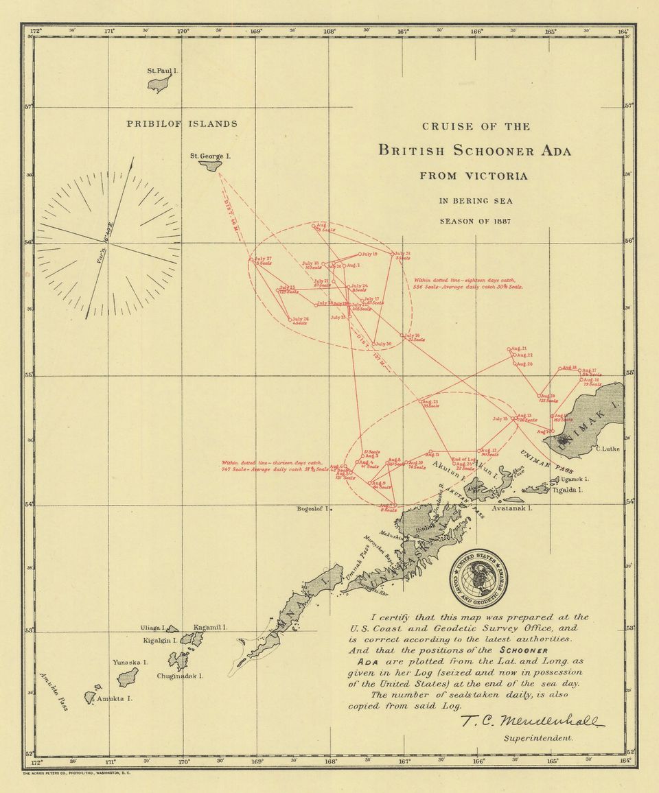 Les cartes de saisie, adoptées à partir du droit maritime, constituaient une autre technique employée pour trianguler les mouvements des animaux en haute mer. Pour faire respecter la souveraineté des États-Unis, les garde-côtes du département du Trésor traquaient les goélettes étrangères qui chassaient ces animaux et saisissaient celles qui se trouvaient dans les eaux étatsuniennes. Des cartes réalisées à partir des journaux de bord des goélettes capturées reconstituaient leurs voyages afin de fournir une preuve légale de leur intrusion. Les points indiquaient les lieux, les dates et le nombre d’otaries capturées; triangulés, ils révélaient les lieux de rassemblement de ces mammifères en haute mer. En comparant les cartes, le tribunal a identifié des « zones d’abondance » et des « zones de vie dense des otaries »1.