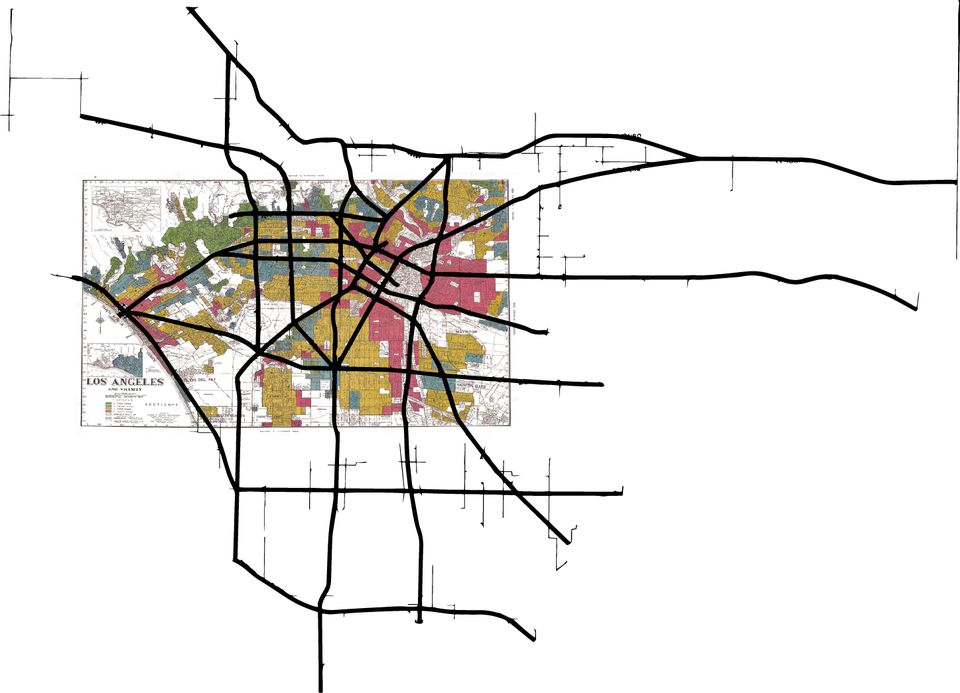 Carte illustrant l’emplacement général des autoroutes proposées par l’Automobile Club of Southern California (1937) superposée à la carte « redlining » [ciblage discriminatoire] de 1939 de la Home Owners Loan Corporation (HOLC) indiquant les risques hypothécaires sur la base de critères économiques et raciaux dans le centre de Los Angeles © Automobile Club of Southern California. Tous droits réservés