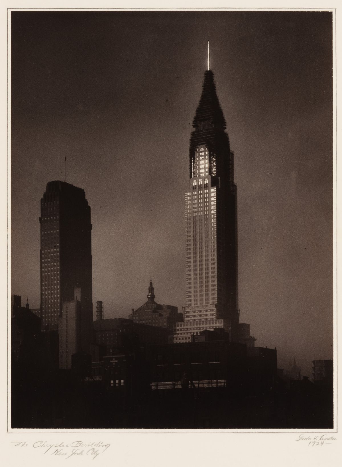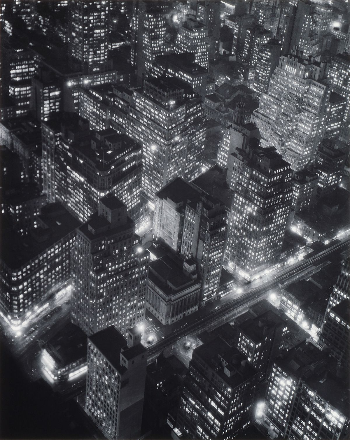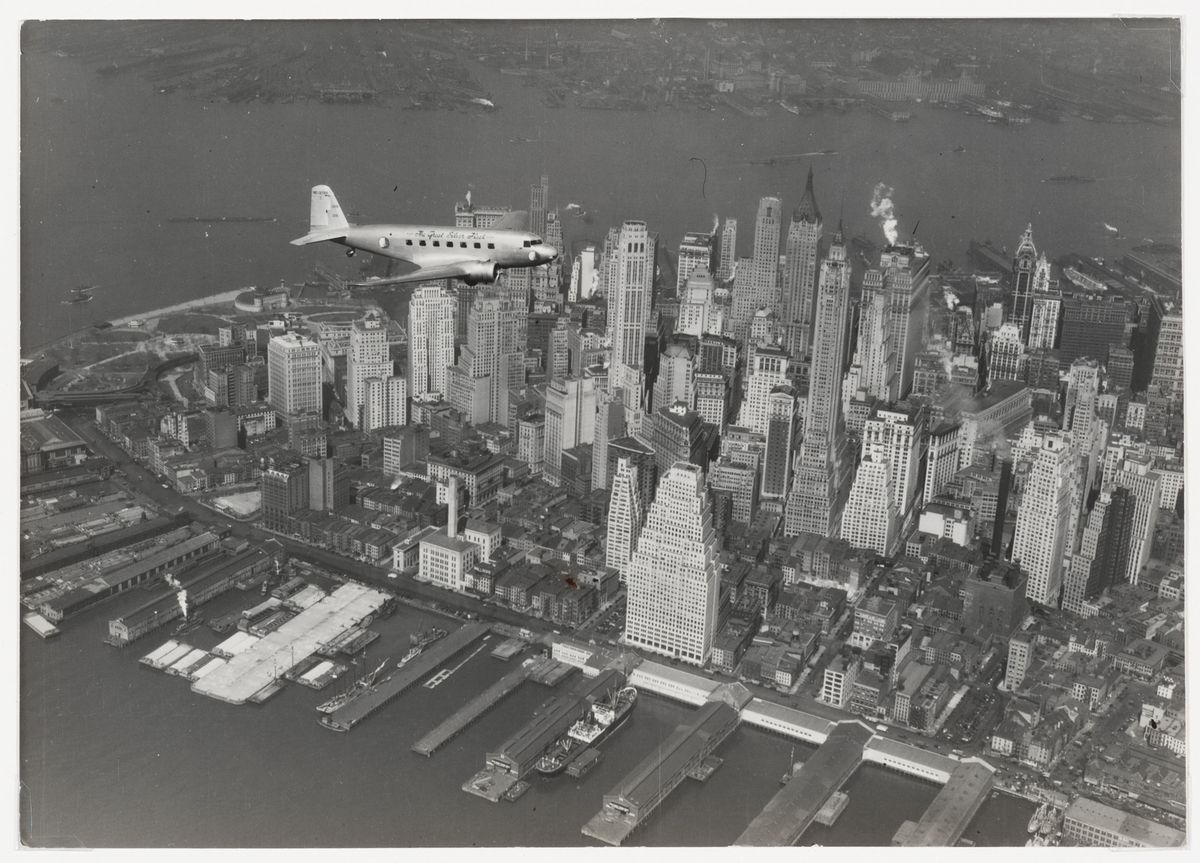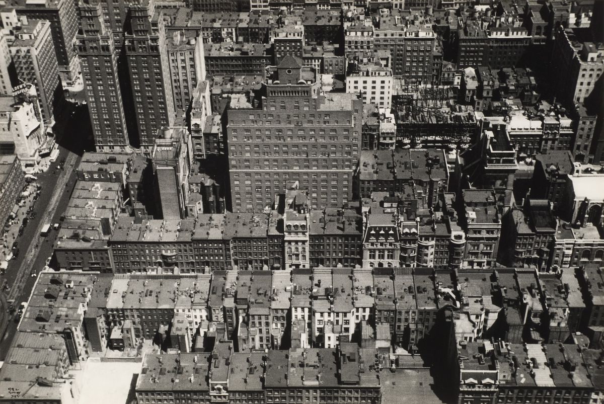 À preuve les images d’une 5e Avenue affairée, du Flatiron Building et du Rockefeller Center, ainsi que de l’édifice Chrysler en construction, photographié par Walker Evans avant que l’édifice ne devienne un symbole de la ville. À cette époque, Evans a pris la photo pour une publicité annonçant un constructeur d’autos dont l’avenir semble illimité. (Evans travaillera plus tard à contrat pour le compte d’un des occupants de l’édifice, lorsque le magazine _Fortune _ lui demande, ainsi qu’à James Agee, de documenter la situation critique des métayers en Alabama.) Viennent ensuite la célèbre silhouette nocturne de la ville, immortalisée dans une photo du début des années 1930 que Berenice Abbott a prise du sommet de l’Empire State Building fraîchement achevé; et l’image d’un DC-2 survolant la ville, réalisée par Margaret Bourke-White – la photo peut aujourd’hui sembler sinistre, avec cet avion argenté voltigeant au-dessus de Lower Manhattan.