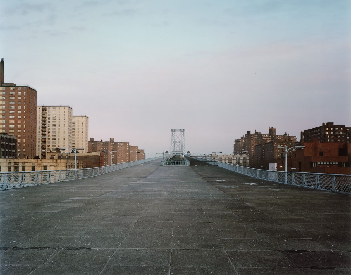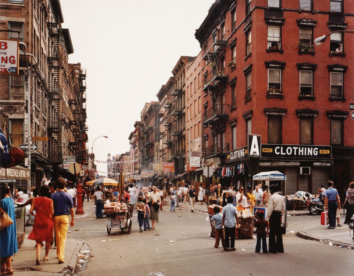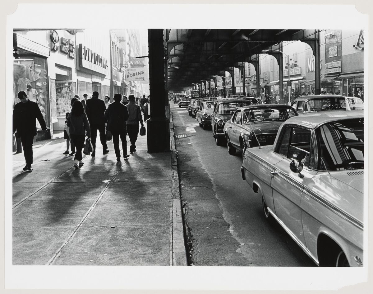 D’autres photos témoignent davantage de scènes quotidiennes. Une vue aérienne d’Ilse Bing balaie les maisons en rangées entassées dans les rues débouchant sur des avenues où se dressent de hauts immeubles. Une scène de rue captée par Charles Pratt montre les embouteillages engendrés sous une voie de chemin de fer suspendue à Queens. Norman McGrath documente une succursale de Macy’s installée dans un centre commercial de Staten Island (début des années 1970), au moment où une partie de la population de Manhattan décide d’aller vivre dans les banlieues. Des photographies des années 1980 et du début des années 1990, réalisées par Ray Mortenson, Brian Rose et Ed Fausty ainsi que Robert Burley, évoquent les luttes de la ville, alors plus morne et plus dangereuse.