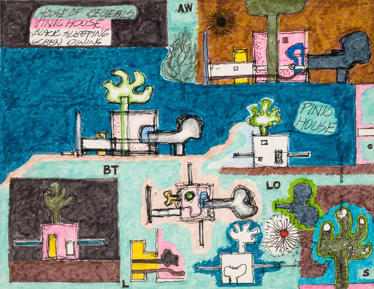 Le rose constitue une anomalie chromatique. Cette couleur, qui n’appartient pas au spectre lumineux et qui techniquement n’existe que comme une nuance du rouge, revendique pourtant une identité propre. En suivant le fil rouge du rose dans la collection du CCA, on recense des projets où l’expression architecturale fait appel à cette couleur : intérieurs rose poudré; extérieurs bleu rosé; ambiances pêche tendre; figurations en coupe, de couleur rose chair; notes de service roses; papier peint aux multiples nuances de rose ; excavations à la teinte rose Miami; dégradés de rose sur des fragments de cimaises; notices fuchsia, métaphores subversives roses; chaise aux tons de corail, panthère rose, formules de préparation et palettes de rose sont autant d’invitations à découvrir les possibilités de cette tonalité singulière.