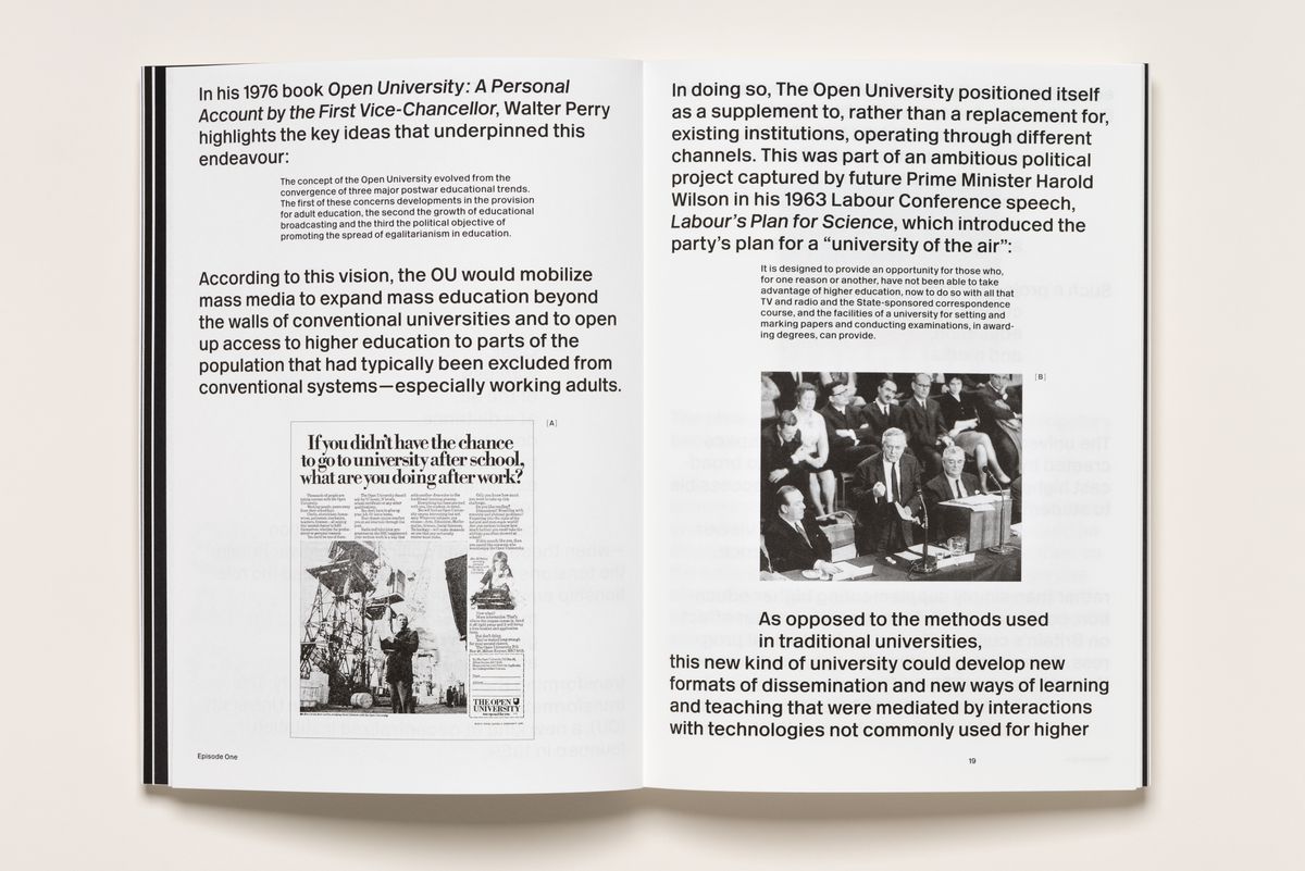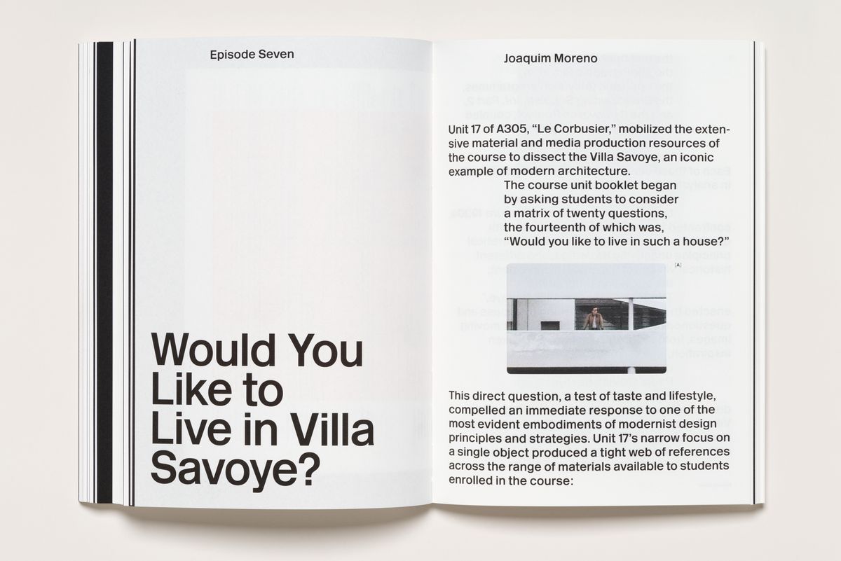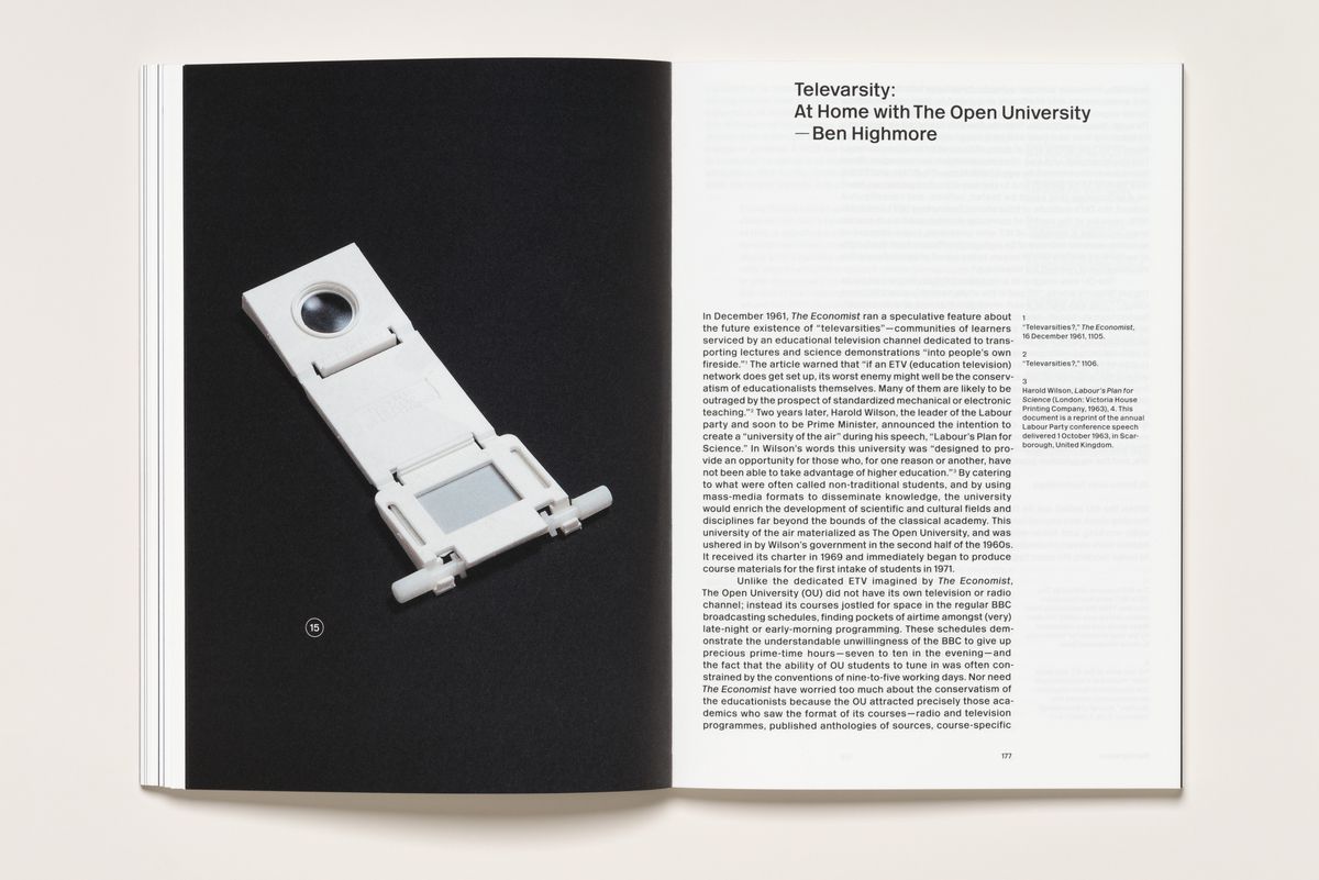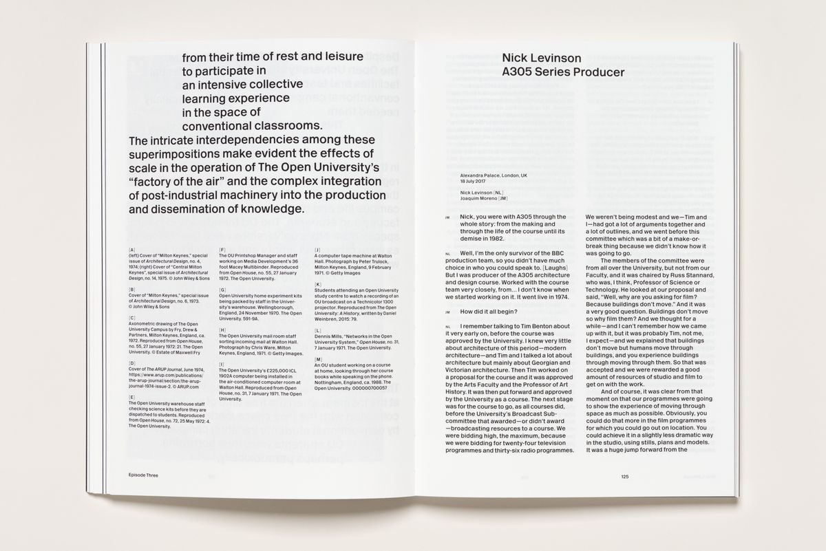 The university is now on air, broadcasting modern architecture examine une expérience clé menée par l’Open University pour mobiliser de nouveaux environnements médiatiques pour l’éducation à distance et l’éducation des adultes. Huit épisodes écrits par Joaquim Moreno, des conversations avec Tim Benton, Nick Levinson, Adrian Forty, Joseph Rykwert et Stephen Bayley, et des contributions de Nick Beech, Laura Carter, Ben Highmore et Joseph Bedford, offrent une lecture attentive du cours A305, « History of Architecture and Design 1890–1939 », qui a été enseigné à travers des programmes de télévision et de radio diffusés sur les ondes de la BBC, entre 1975 et 1982.