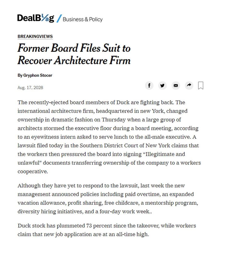 « Les éditeurs se trompent lorsqu’ils pensent qu’ils sont engagés dans une longue campagne culturelle axée sur le changement de discours. On ne va pas changer la culture chez Gensler en plaçant un article sous leurs yeux, mais en formant un syndicat. »
