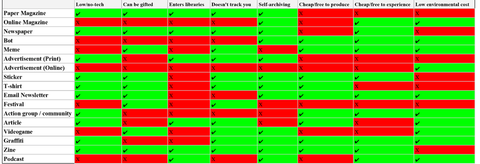 Ce guide utilise toutes sortes d’outils dont des jeux, des diagrammes, des histoires, des absurdités, une vidéo d’accompagnement, un faux journal et un texte généré par des algorithmes. Ils apparaissent tout le long du guide et pas seulement dans la section sur les nouveaux outils.