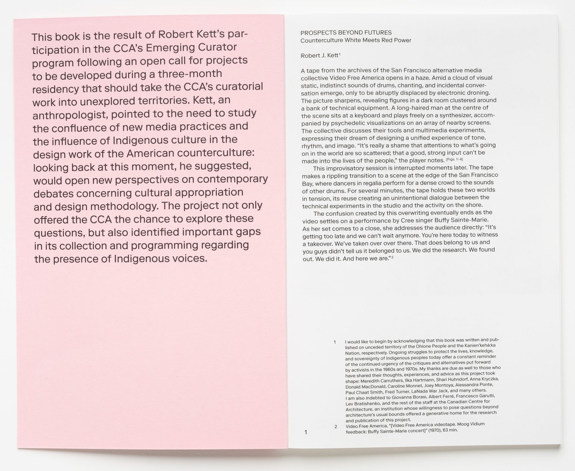 Kett, un anthropologue et commissaire basé en Californie, a souligné la nécessité d’étudier la confluence entre les nouvelles pratiques médiatiques et l’influence des cultures autochtones sur la contre-culture américaine dans son approche du design. Revenir sur cette époque, avait-il avancé, permettrait d’envisager sous d’autres angles les débats en cours sur l’appropriation culturelle et les méthodologies du design. En donnant l’occasion au CCA d’explorer ces questions, le projet a également mis en lumière des lacunes significatives au sein de sa collection et de sa programmation en ce qui a trait à la présence de voix autochtones.