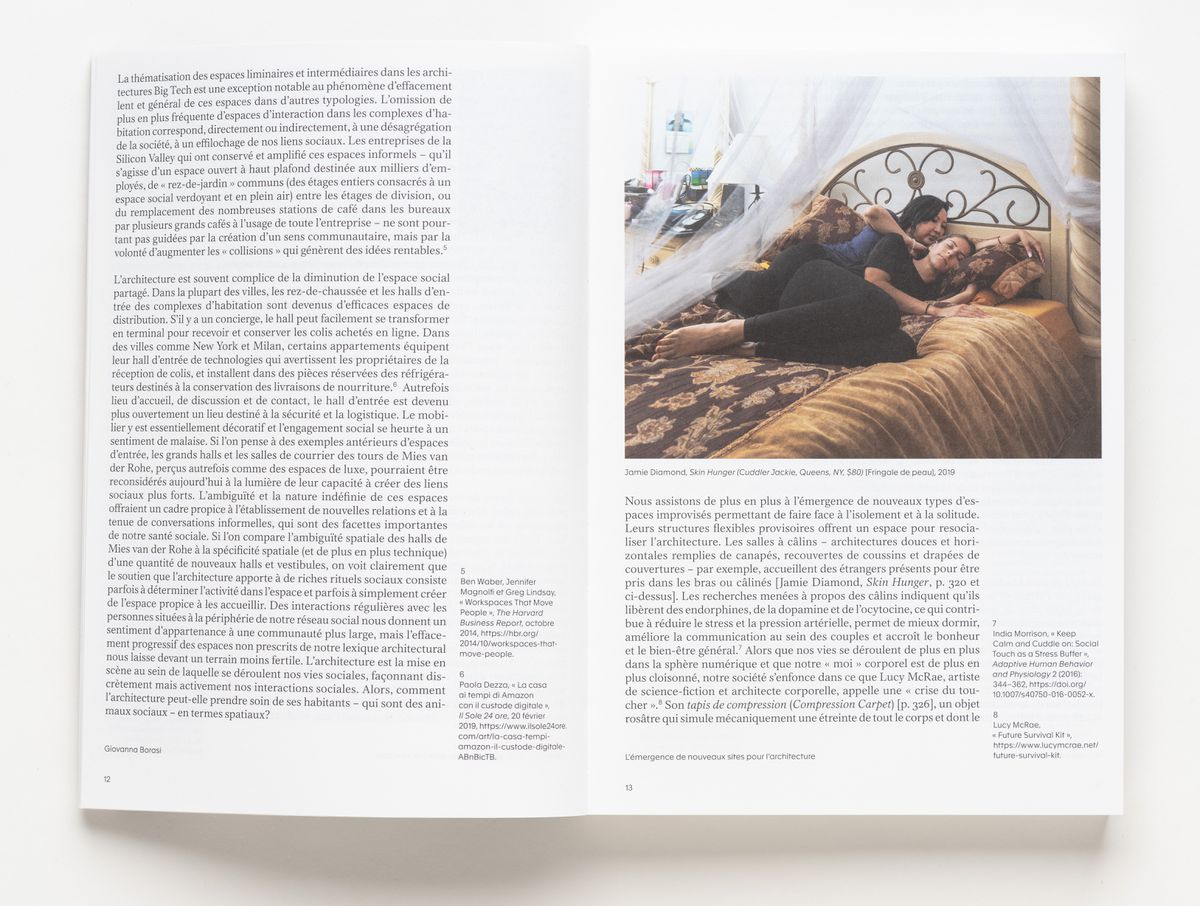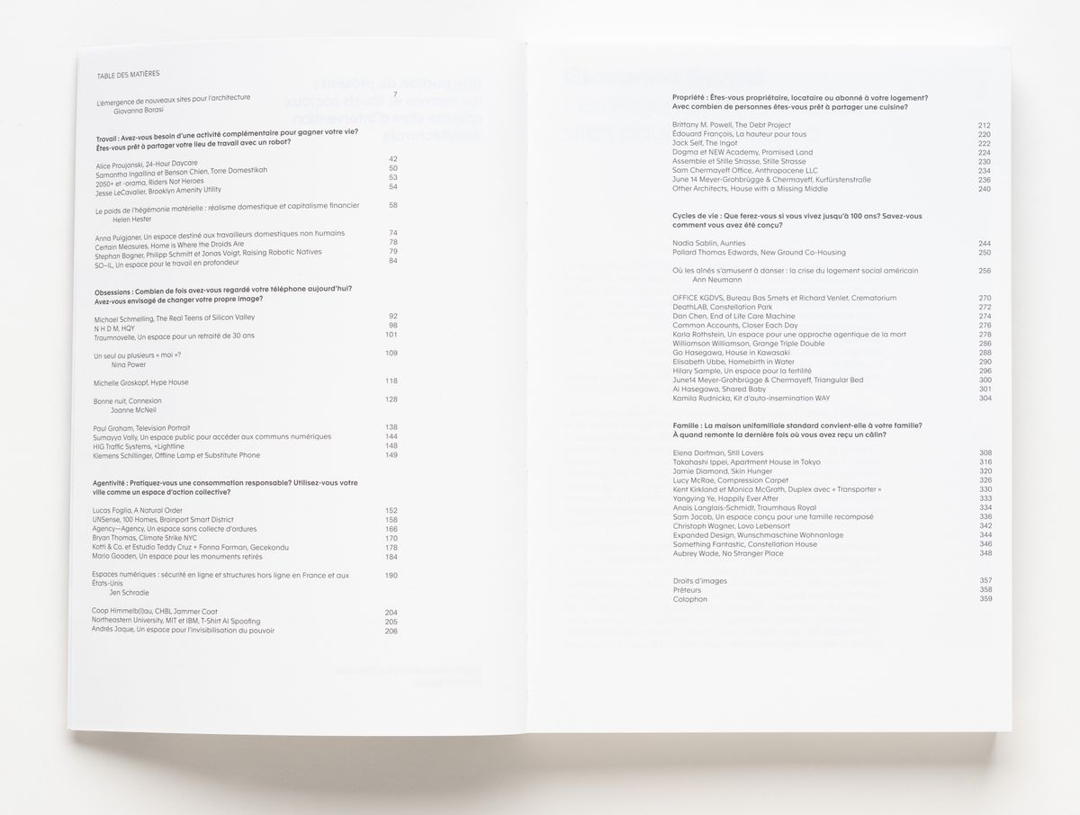 Contributeurs : 2050+ and -orama; Agency-Agency; Christopher Anderson; Nicolas Asfouri, Assemble Studio; Center for Spatial Technologies; Certain Measures; Dan Chen; Sam Chermayeff Office; Benson Chien and Samantha Ingallina; Aaron M. Cohen; Thaddé Comar; Common Accounts; Coop Himmelb(l)au; Estudio Teddy Cruz+Fonna Forman and Kotti+Co; Degelo Architekten and Gamperle AG; Cynthia Deng and Arta Perezic; Jamie Diamond; DOGMA and New Academy; Elena Dorfman; Expanded Design; Lucas Foglia; Maison Edouard François; The Future Market; Salwan Georges; Ginger Design Studio; Mario Gooden; Paul Graham; Michelle Groskopf; Max Hampshire, Paul Kolling, and Paul Seidler; Ai Hasegawa; Go Hasegawa+Associates; Helen Hester; Het Nieuwe Instituut; HOME-OFFICE; Marisa Morán Jahn and Rafi Segal; Sam Jacob; Andrés Jaque; Dafydd Jones; Valérian Mazataud; June14 Meyer-Grohbrügge & Chermayeff; Anaïs Langlais-Schmidt; LATENT Productions and Columbia University GSAPP DeathLAB; Jesse LeCavalier; Joanne McNeil; Lucy McRae; Mueller Sigrist Architekten; Christinne Muschi; Ann Neumann; N H D M; Ewa Nowak; Brittany M. Powell; Nina Power; Alice Proujansky; Anna Puigjaner MAIO; Karla Rothstein; Kamila Rudnicka; Nadia Sablin; Hilary Sample; Klemens Schillinger; Michael Schmelling; Jen Schradie; Jack Self; SO–IL; Space Popular; Giulia Spadafora; Special Projects; Marie-Claire Springham; Stefan Marx; OFFICE Kersten Geers David Van Severen; Other Architects; Pollard Thomas Edwards; Republic of Estonia; reWork; Something Fantastic; StrongArm Technologies; Takahashi Ippei Office; Teple Misto; terra0; Bryan Thomas; Traumnovelle; Elisabeth Ubbe; UNSense; Sumayya Vally; Jonas Voigt, Philipp Schmitt, and Stephan Bogner; Aubrey Wade; Christoph Wagner Architekten; Nick Waplington; Williamson Williamson; Hardy Wilson; Yangying Ye.