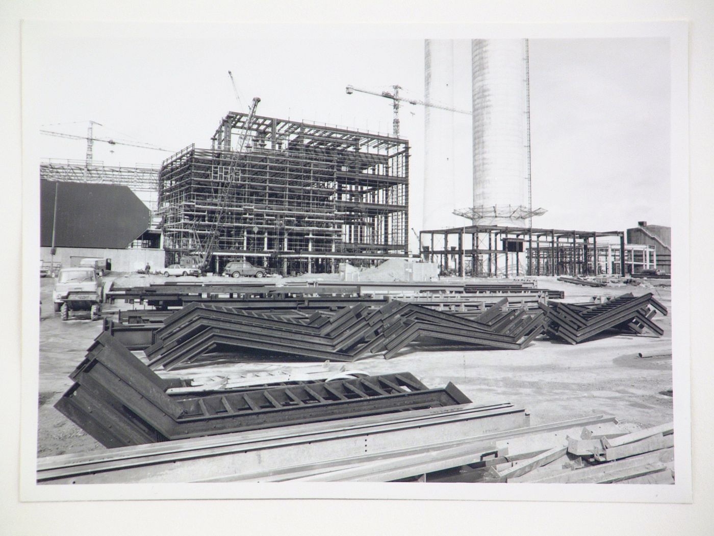 View of steel beams used for construction of power station, United Kingdom