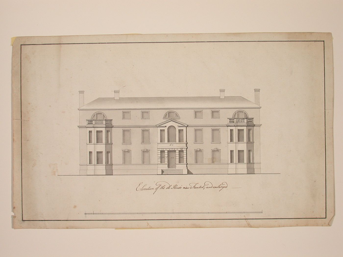 inscribed - Elevation of the old House new Fronted, and enlarged (lower centre, brown ink), MOUNT/FRAMED 3/4 Black CUSH (verso, centre left, graphite) (scale bar, no scale indicated, lower centre, black ink)