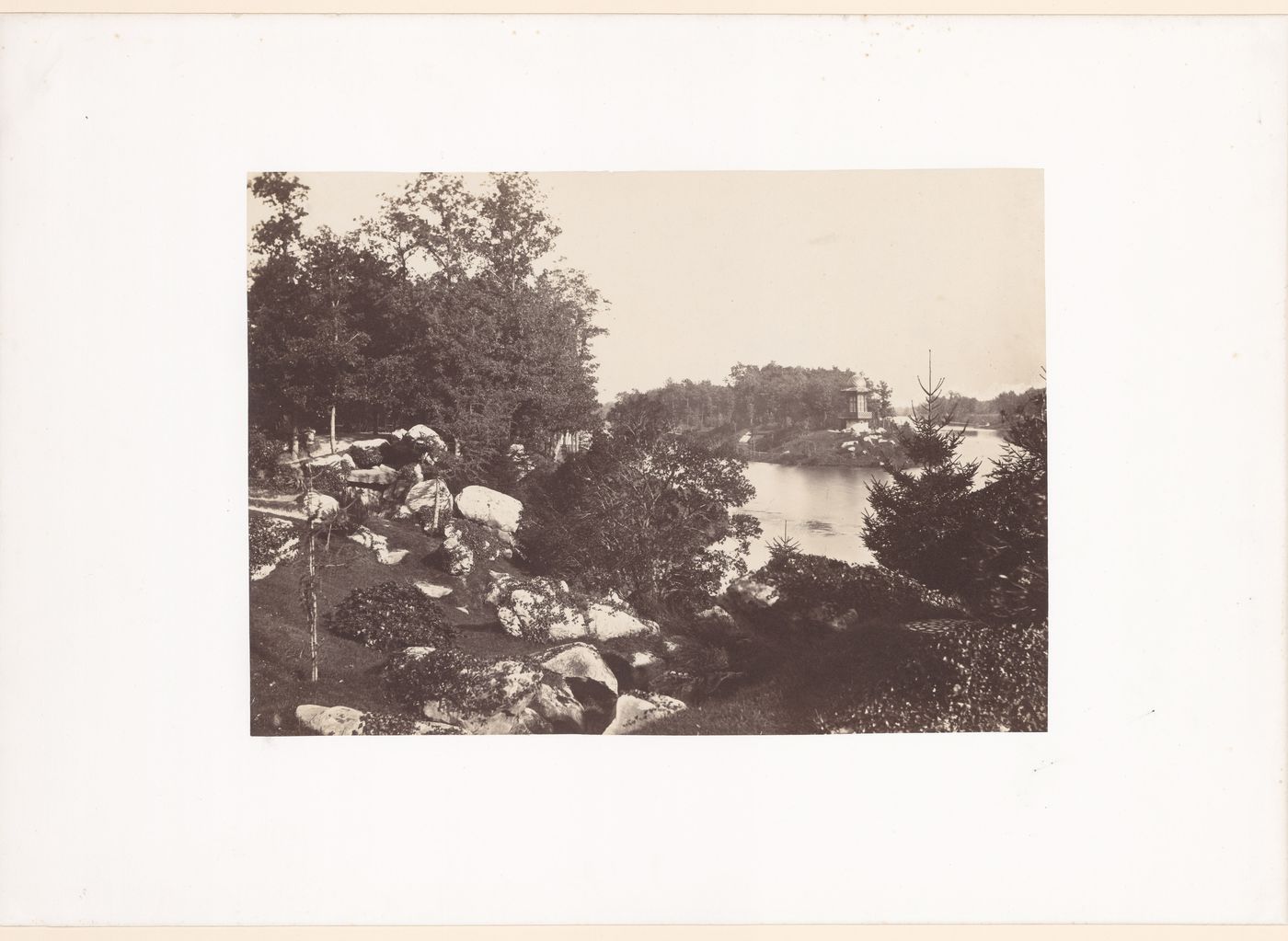 View of the Lac Inférieur, pointe sud de l'île et belvédère, Bois de Boulogne, Paris, France