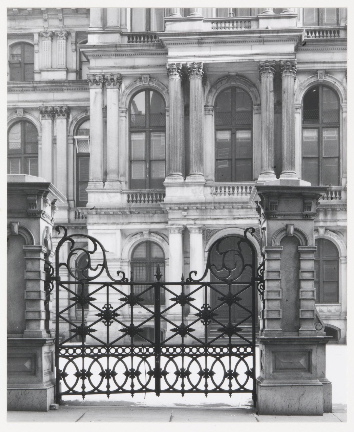 View of entrance gate and facade, Old City Hall, Boston, Massachusetts, United States
