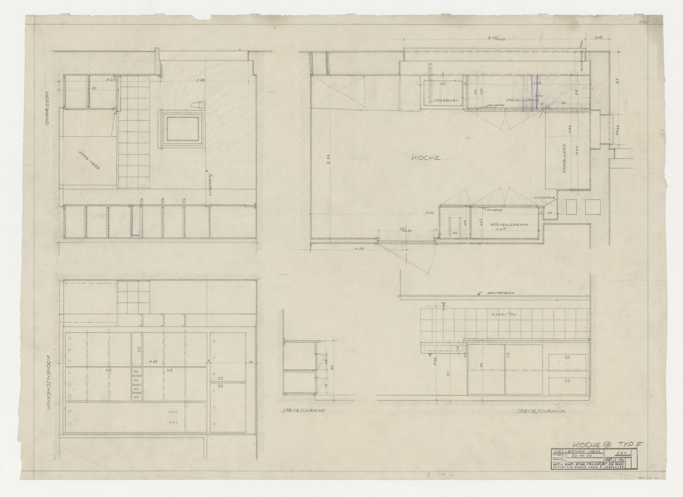 stamped - in black ink, l.r.: "fertiggestellt / den [with date and drawing number] / abgeändert / den [blank space] MST. [with scale] / ARCH. MART STAM, FRANKFURT AM MAIN / VERTRETEN DURCH ARCH. F. LEBZELTER"" inscribed, numbered and dated - by the draughtsman, in graphite, l.r.: "KÜCHE 1 [within circle] TYP F" and "HELLERHOF 1931 / 661 / 20. 11. 30 / [with scale]" [within stamp]; and throughout: with dimensions, component functions and elevation orientations inscribed - by an unknonw hand, u.r.: "60//85"