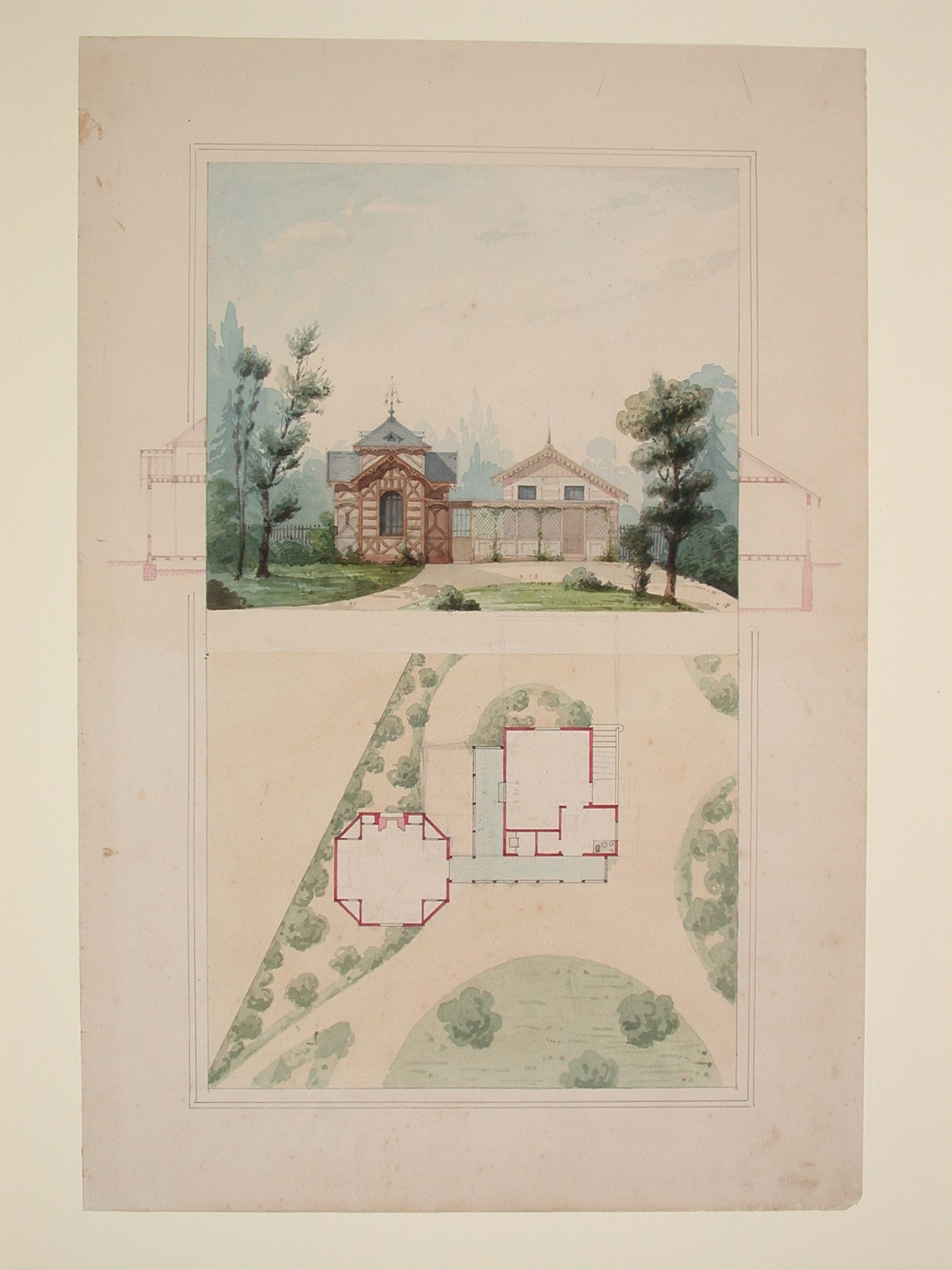 - This plan and elevation show a dwelling, possibly a cottage, consisting of two structures linked by a veranda.
