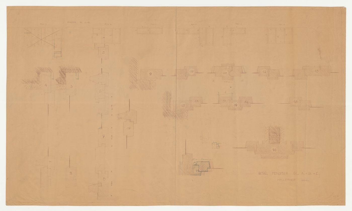 inscribed - by the draughtsman, on the original, l.r.: "DETAIL FENSTER BL. A. + B. + C. / HELLERHOF 1930." signed and dated - by the draughtsman ?, on the original, l.r.: "L [underlined] 6.3.30."