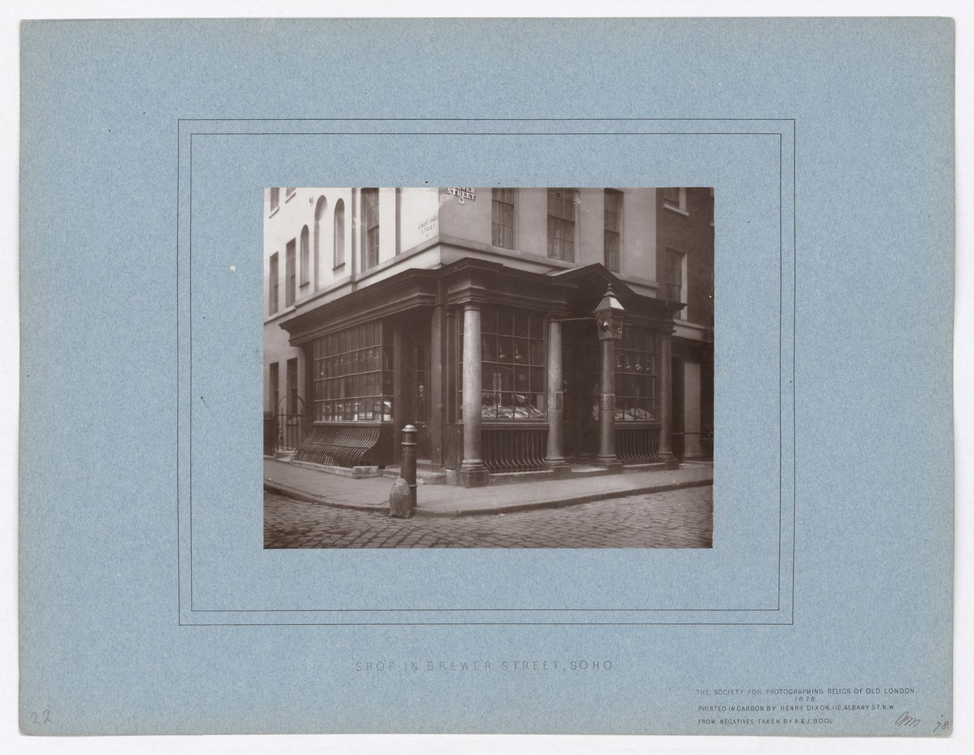 inscribed - 22 (on image, LL, printed in from negative), Am78 (on mount, LL, in unknown hand, in black ink) stamped - THE SOCIETY FORPHOTOGRAPHING RELICS OF OLD LONDON 1878 PRINTED IN CARBON BY HENRY DIXON,112, ALBANY ST. N.W. FROM NEGATIVES TAKEN BY A & J BOOL (On mount, LR, stampedin black ink), SHOP IN BREWER STREET, SOHO (on mount, LC, stamped in blackink)