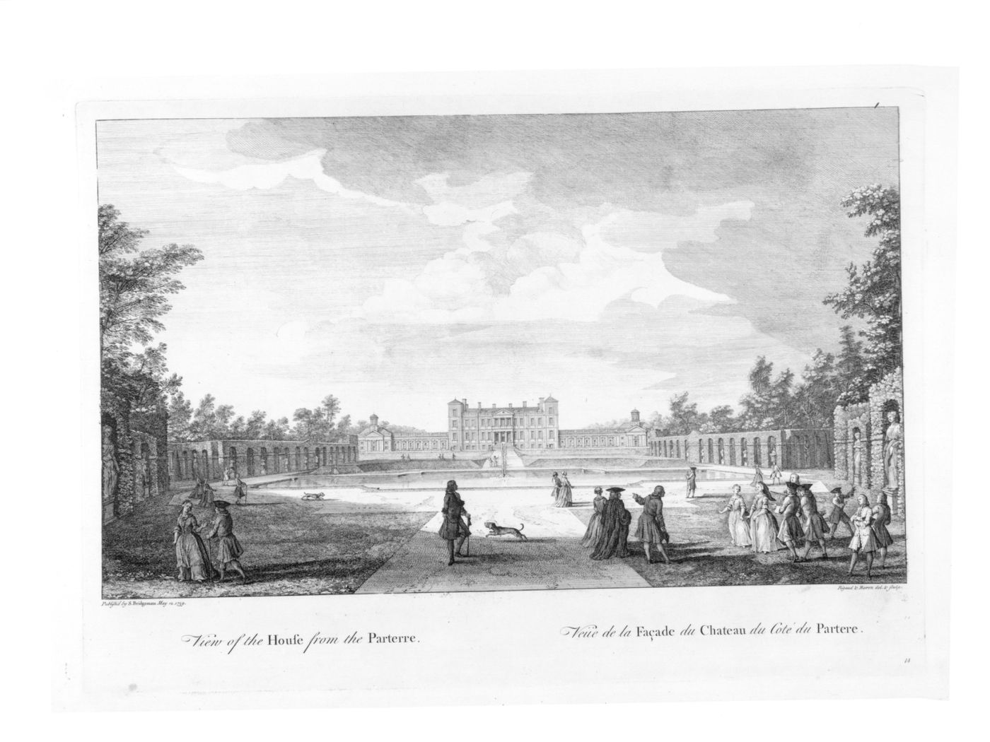 imprinted - l.l.: "Published by S. Bridgeman May 12. 1739."; l.r.: "Rigaud & Baron del. & Sculp. / 14"; b.l.: "View of the House from the Parterre."; b.r.: "Veüe de la Façade du Chateau du Coté du Parterre."
