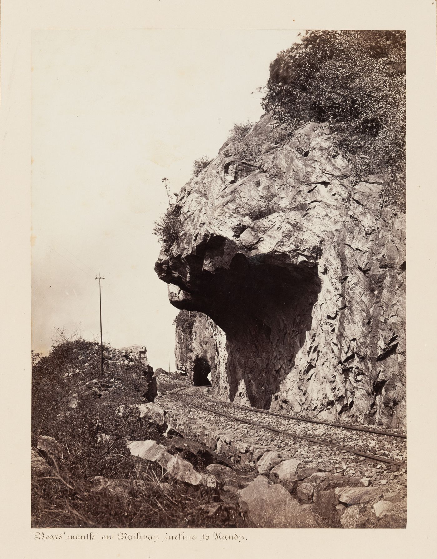 View of the "Bears' Mouth" on the Colombo-Kandy Railway with a tunnel in the background, possibly Tunnel No. 9, Ceylon (now Sri Lanka)